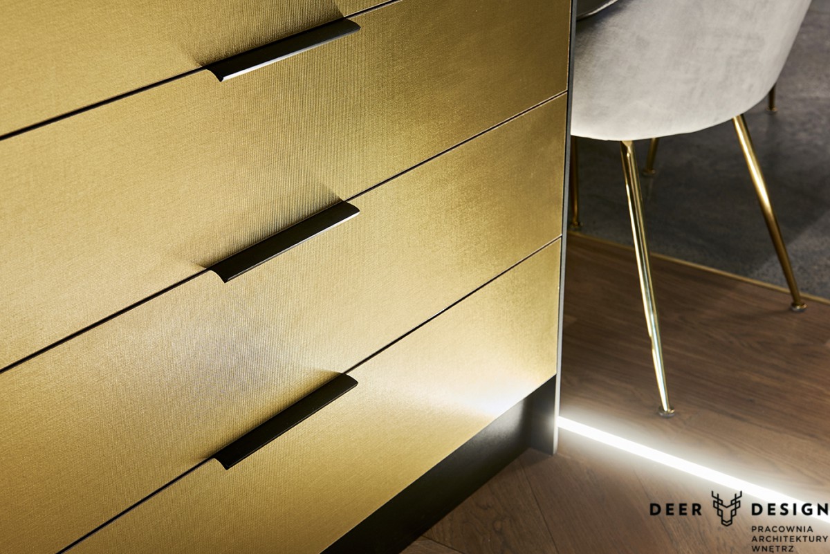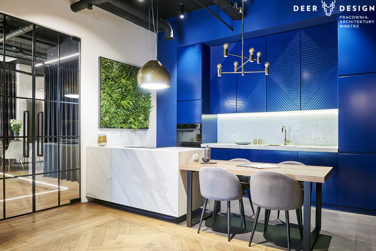 Ekspozycja to 250 m2 powierzchni wypełnionej materiałami i rozwiązaniami, które klient może zobaczyć i przetestować podczas wizyty w pracowni. Dwie, różne od siebie kuchnie, detale na ścianach, ekspozytory z drewnianymi podłogami, płytkami i ogromny wachlarz próbek farb, tapet czy kamieni. Wcześniejsi najemcy lokalu prowadzili tu fitness klub połączony z przestrzenią zabaw dla dzieci. Architektom z Deer Design zależało na wyznaczeniu stref. Od rozmowy przy stole, przejście przez przestrzenie pokazowe jak łazienka czy kuchnia, aż do miejsca gdzie swobodnie architekt może stworzyć moodboard z proponowanych dla klienta materiałów. Pierwsze wizualizacje pracowni to zachowawcze zabudowy kuchenne i stonowane kolory. Architekci jednak zdecydowali się pokazać niestandardowe rozwiązania takie jak kuchnia w niebieskim kolorze, frezowane fronty, wyspy kuchenne, czy funkcjonalne systemy szuflad. Klient może już na pierwszym spotkaniu zobaczyć to, co niesztampowe i pozbawione utartych schematów. Wszystkie te elementy wystroju tworzą swego rodzaju eklektyzm, dlatego w pracowni ściany pomalowane zostały na czarny kolor, który tworzy idealne tło do pokazania różnego rodzaju faktur i kolorów dostępnych materiałów. Jedynie w kuchni utrzymanej w ciemnej kolorystyce zastosowano ściany w jasnych kolorach dla pokazania kontrastów i spójności pomieszczeń. Każdy klient może poczuć się tu wyjątkowo i wraz z architektem odbyć przyjemny spacer po wszystkich pomieszczeniach.