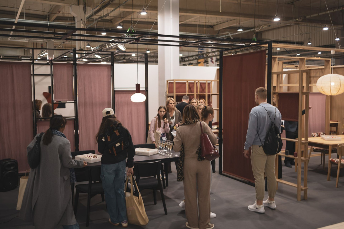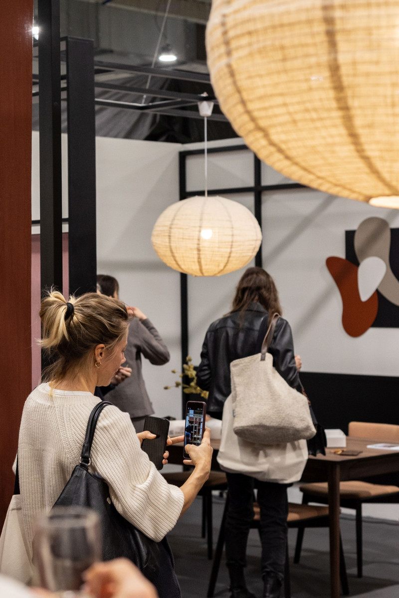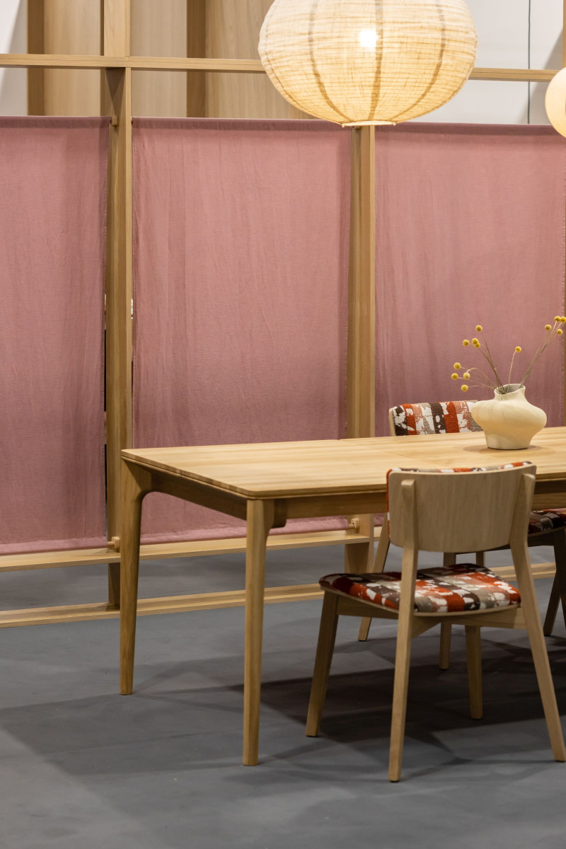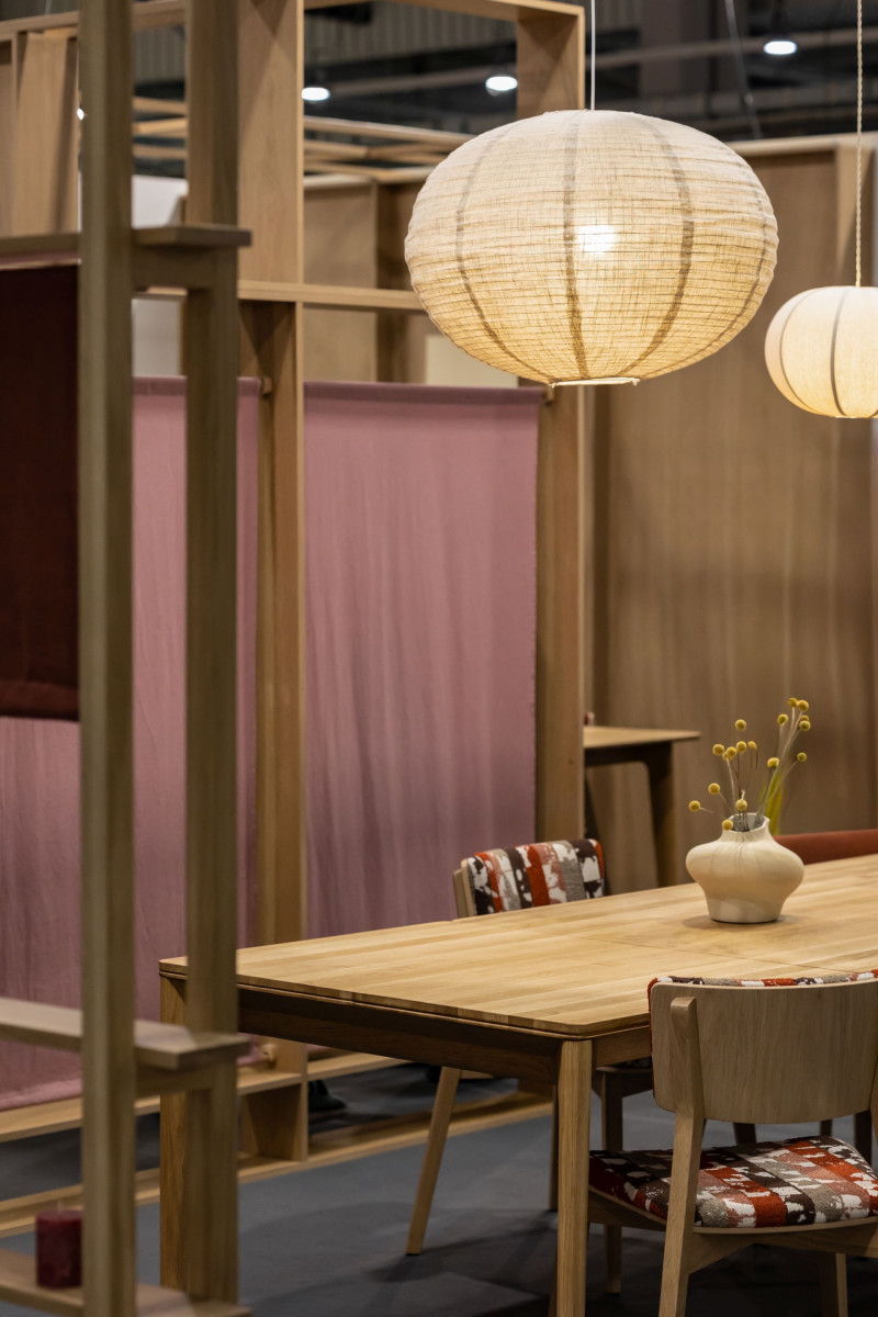 Stoisko MOTE wyróżniało się w tłumie targów w sposób nieoczywisty – nie ciężką, ekspresyjną formą, lecz spokojem, minimalizmem i naturalnym pięknem drewna. Przypominało japońskie wnętrze: oszczędne, harmonijne, wypełnione światłem i spokojem. Lekkie, półprzezroczyste tkaniny dzieliły przestrzeń na intymne „pokoje”, w centrum każdego z nich stał stół z litego drewna, który przyciągał uwagę i zachęcał do siadania i spotkań.