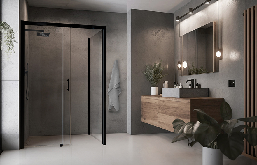 Modern bathroom with concrete walls, wooden cabinet, shower, sin
