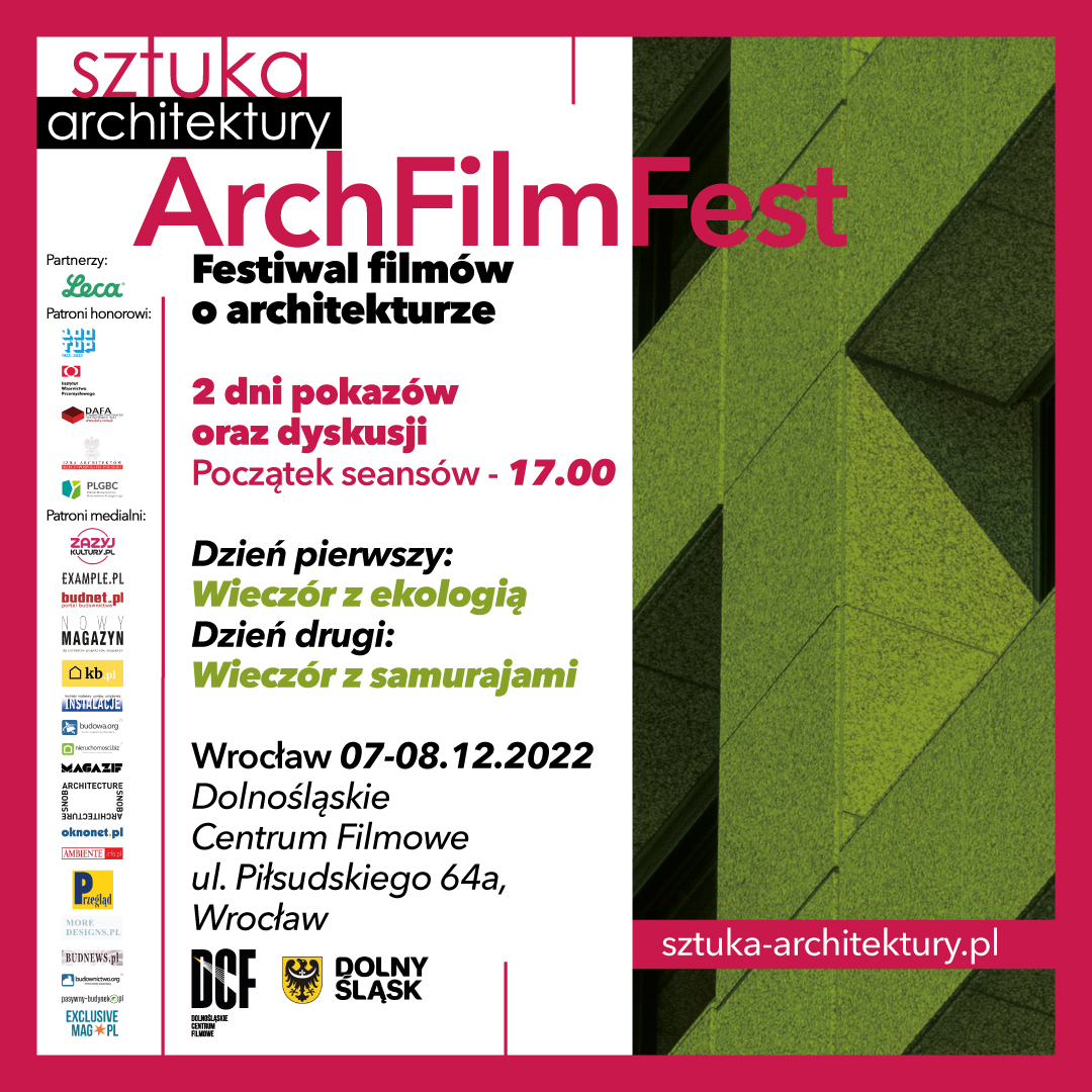Festiwal Filmów o Architekturze ArchFilmFest zawita tym razem do Wrocławia. Program pokazów i dyskusji dotyczyć będzie m.in. wyzwań środowiskowych, które są jednym z najważniejszych zagadnień z jakim musi mierzyć się współczesna architektura i budownictwo. Poruszymy również temat japońskiej architektury, która niesie ze sobą inspiracje tradycyjnym, japońskim budownictwem drewnianym oraz prostotę. Festiwal odbędzie się w dniach 7-8 grudnia 2022, start godz. 17:00 w Dolnośląskim Centrum Filmowym, ul. Piłsudskiego 64a.