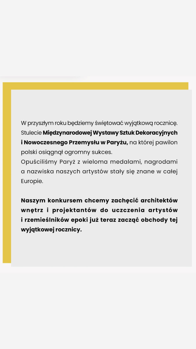 Polski pawilon w Paryżu zachwycił wielu gości i wypromował nazwiska naszych artystów w całej Europie. Prezentowany w nim design zwracał uwagę elegancją, funkcjonalnością i innowacyjnymi rozwiązaniami. Dlatego źródłem inspiracji konkursowego mebla ma być właśnie estetyka tamtych czasów. Rzecz jasna, nie chodzi o dosłowne naśladownictwo, lecz posiłkowanie się pewnymi ideami, rozumienie istoty designu czy też określone podejście do jego projektowania.