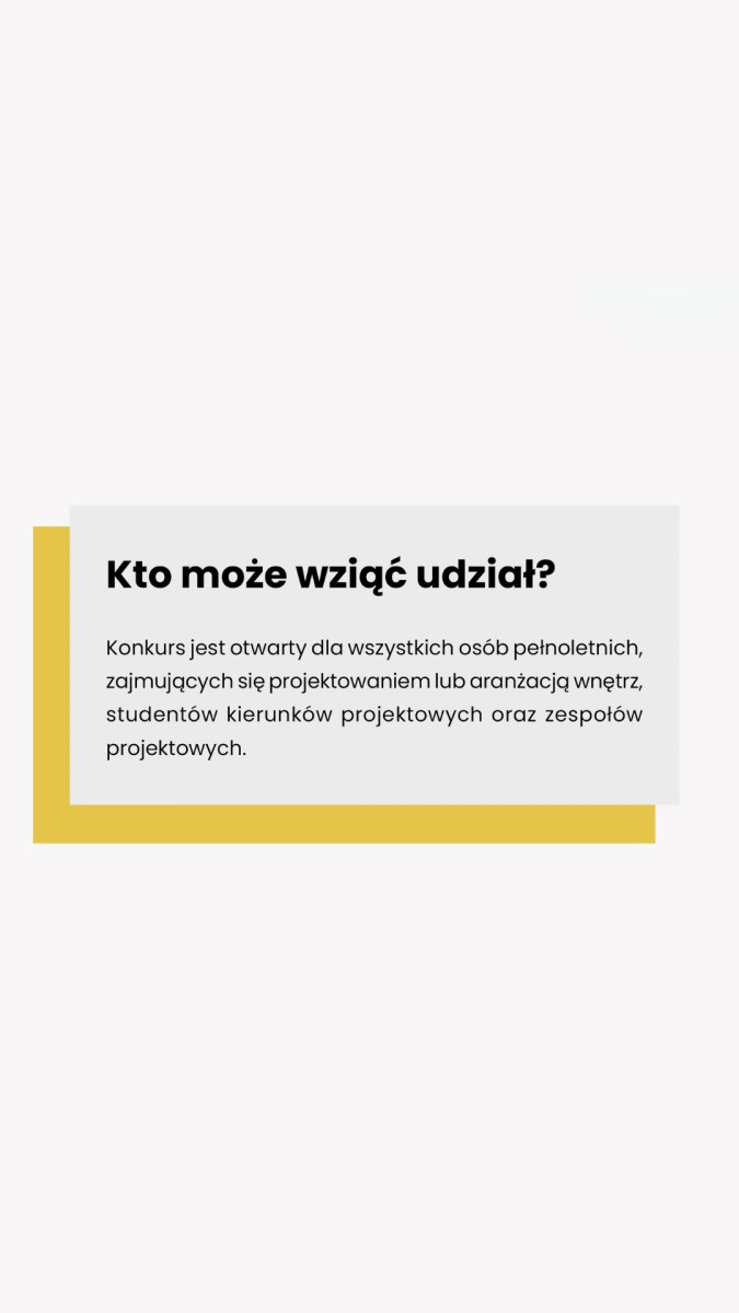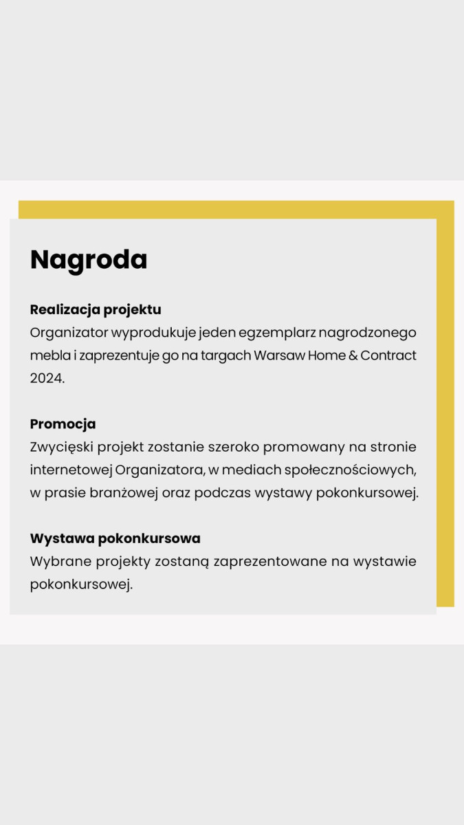 W konkursie mogą wziąć udział osoby zajmujące się projektowaniem lub aranżacją wnętrz, studenci kierunków projektowych lub zespoły projektowe. Termin nadsyłania zgłoszeń mija 14 lipca br. Ogłoszenie wyników konkursu nastąpi podczas uroczystej gali, która odbędzie się 12 września br. Z kolei 23-26 października br. zwiedzający targi „Warsaw Home & Contract 2024” będą mieli niepowtarzalną okazję, by obejrzeć nagrodzoną pracę.