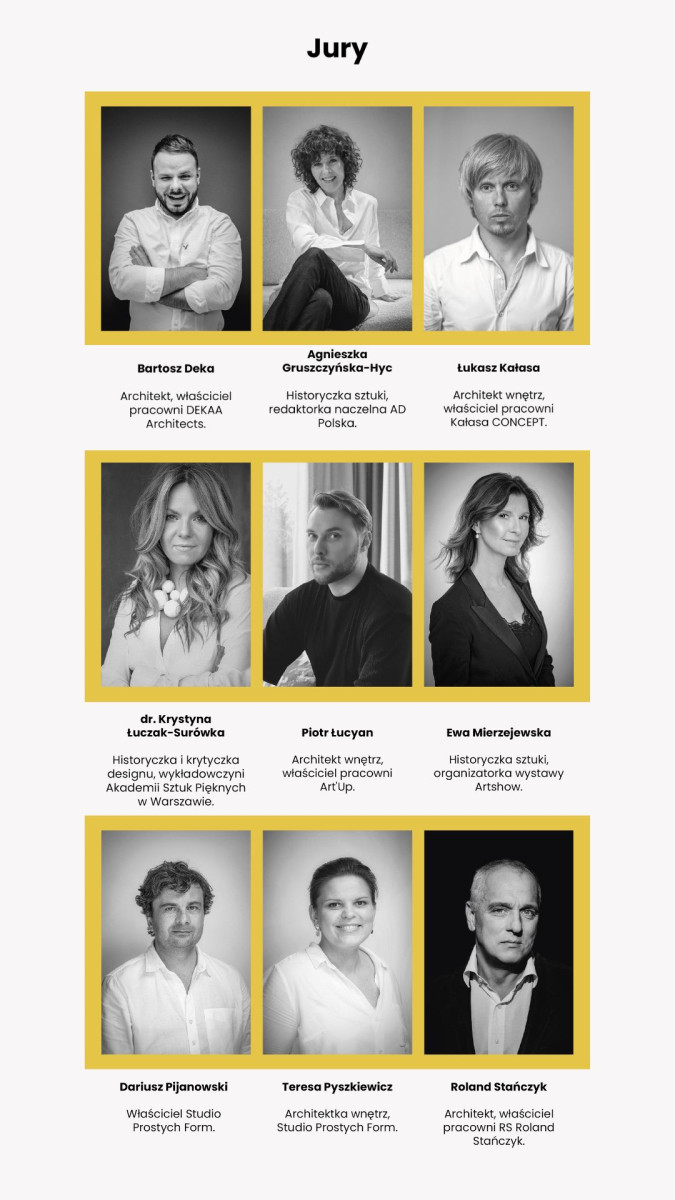 Kto oceniać będzie nadesłane prace? W składzie jury znajdą się osoby o potwierdzonej renomie w branży projektowo-architektonicznej. Będą to: Ewa Mierzejewska (historyczka sztuki, organizatorka wystawy „Artshow”), Dariusz Pijanowski (właściciel firmy Studio Prostych Form), Teresa Pyszkiewicz (architektka wnętrz, Studio Prostych Form), Roland Stańczyk (architekt, właściciel pracowni RS Poland Stańczyk), Bartosz Deka (architekt, właściciel pracowni DEKAA Architects), Agnieszka Gruszczyńska-Hyc (historyczka sztuki, redaktor naczelna „AD Polska”), Łukasz Kałasa (architekt wnętrz, właściciel pracowni Kałasa CONCEPT), dr Krystyna Łuczak-Surówka (historyczka i krytyczka designu, wykładowczyni Akademii Sztuk Pięknych w Warszawie) oraz Piotr Łucyan (architekt wnętrz, właściciel pracowni ArtUp, autor artykułów o designie w magazynie „AD Polska”).