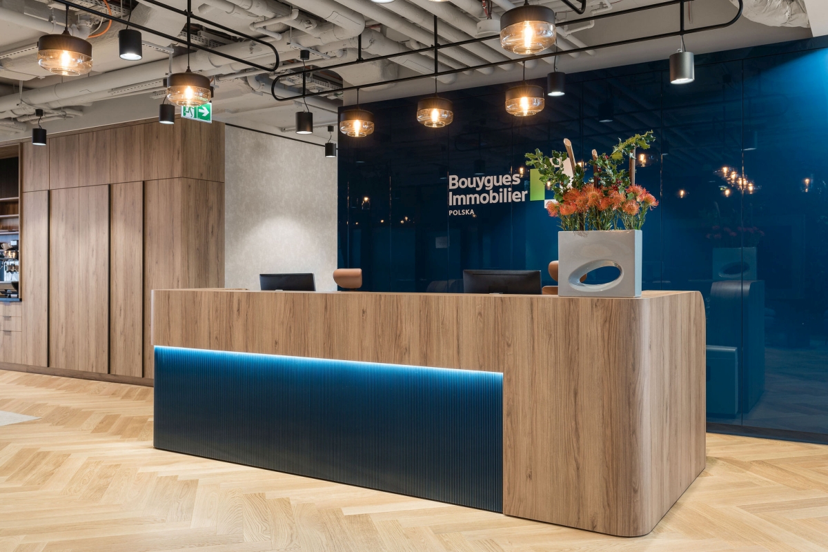 W sercu Warszawy, w prestiżowym biurowcu Rondo 1 przy Rondzie ONZ, znajduje się siedziba Bouygues Immobilier Polska – lidera francuskiego rynku nieruchomości działającego z sukcesami także w Polsce. Biuro, zajmujące ponad 1300 m², jest nie tylko nowoczesnym miejscem pracy, ale także manifestem współczesnego podejścia do przestrzeni biurowych, w których ekologia i zrównoważony rozwój odgrywają kluczową rolę. Za jego koncepcję odpowiadają architekci z pracowni BIT CREATIVE, którzy pod kierownictwem architekta Barnaby Grzeleckiego umiejętnie połączyli kluczowe wartości marki tworząc ergonomiczną przestrzeń, gdzie design jest wyrazem troski o naturę.