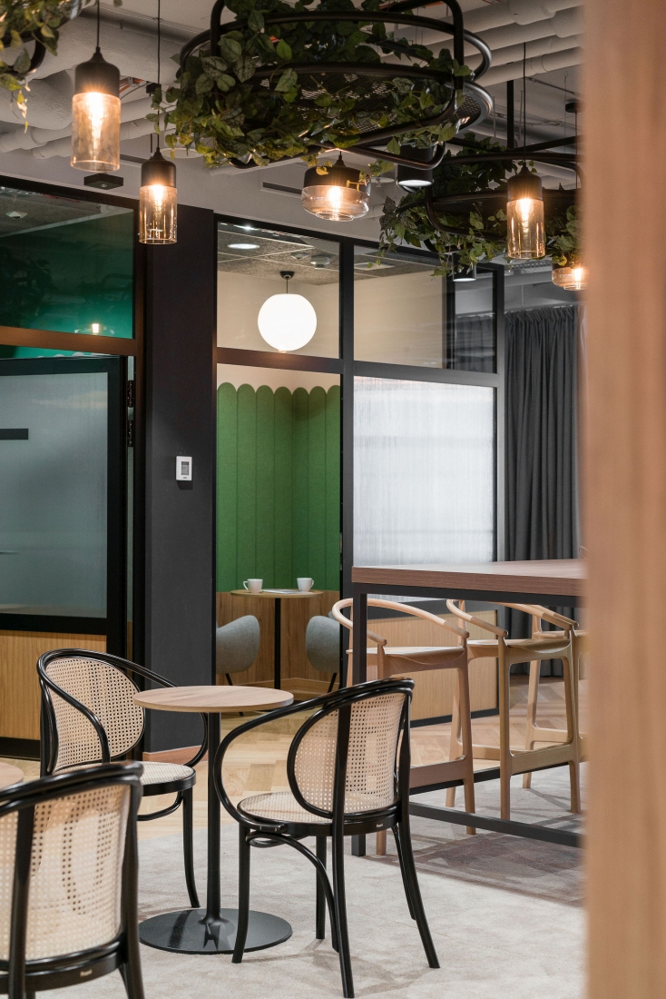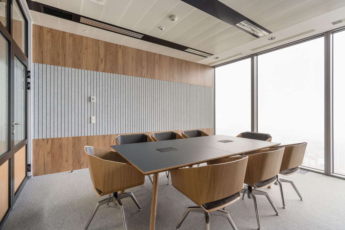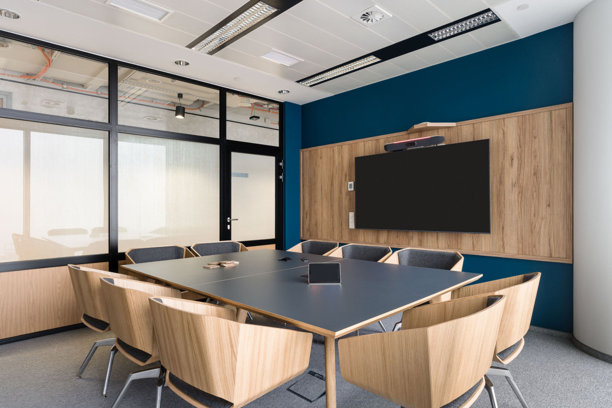 Przestrzeń stricte pracowniczą współtworzą strefy do pracy indywidualnej i zespołowej. Ergonomiczne meble, odpowiednie oświetlenie i rozwiązania akustyczne oraz zastosowanie naturalnych materiałów wspierają efektywność i komfort. Z kolei sale konferencyjne, wyposażone w najnowocześniejszy sprzęt multimedialny, umożliwiają organizację spotkań biznesowych, prezentacji i szkoleń. Przeszklone ściany nadają przestrzeni lekkości, a specjalne panele akustyczne zapewniają komfort dźwiękowy.