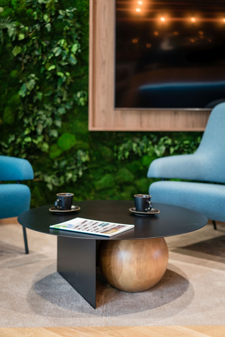 Wnętrze harmonijnie łączy elegancki design z praktycznymi rozwiązaniami, tworząc przestrzeń sprzyjającą zarówno pracy, jak i integracji zespołu. Biuro zostało bowiem zaprojektowane tak, aby spełniać różnorodne potrzeby pracowników i gości. Koncept ten odzwierciedla klarowny podział na strefy funkcjonalne. Przestronna, reprezentacyjna recepcja wita gości nowoczesnym designem, podkreślonym roślinnymi akcentami. To wizytówka firmy odzwierciedlająca jej troskę o ludzi i planetę, ale też podkreślająca profesjonalizm marki.