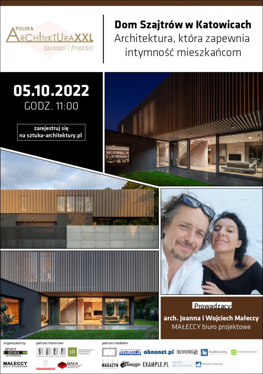 Zapraszamy na prezentację domu w ramach cyklu Finaliści i laureaci Plebiscytu Polska Architektura XXL. Podczas wywiadu autorzy projektu Joanna i Wojciech Małeccy opowiedzą o swojej pracowni, ciekawych projektach i planach na przyszłość. Widzimy się 5 października 2022 o godz. 11:00. Zapisz się już teraz.
