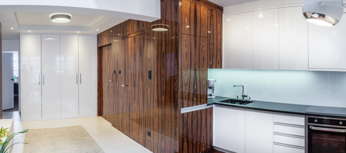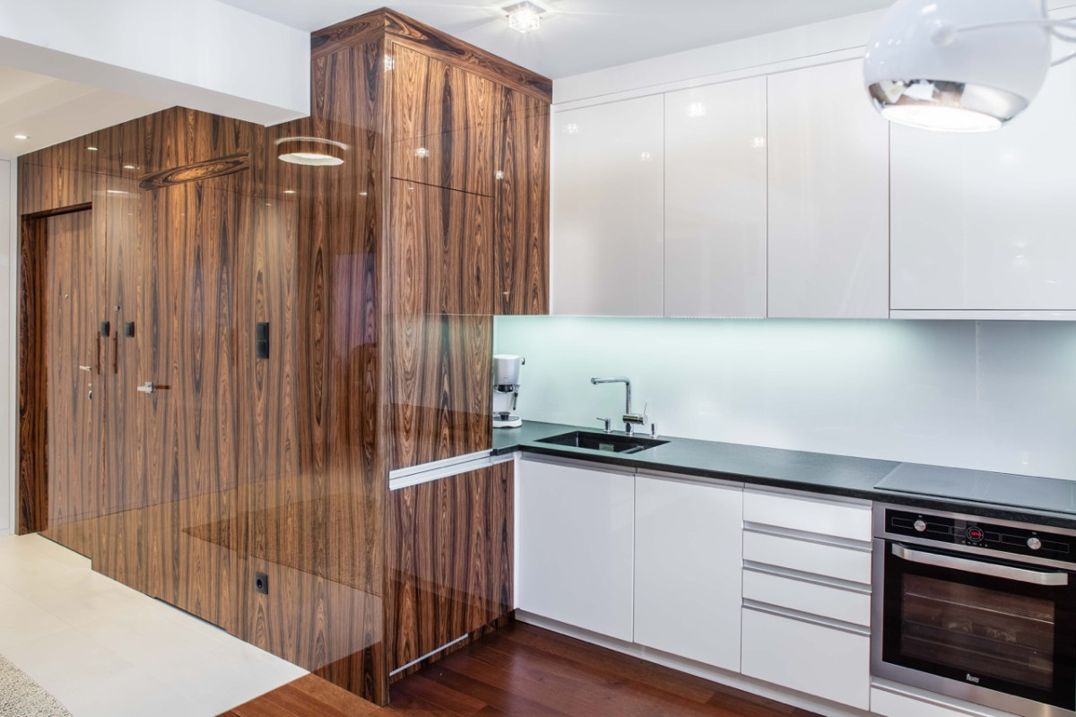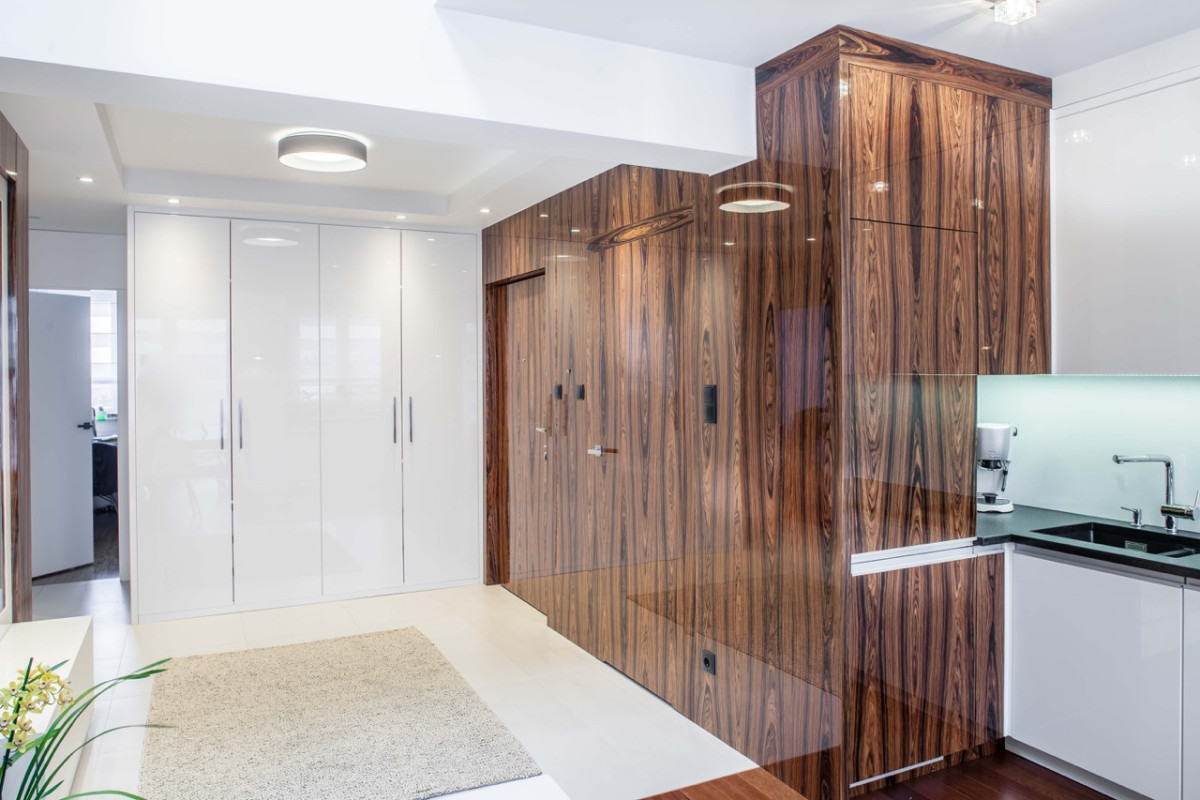 – Przed małą przestrzenią stanęły całkiem spore oczekiwania inwestorki. Pragnęła ona by niewielkie mieszkanie z antresolą zamieniło się w pełni funkcjonalną przestrzeń, dopasowaną do jej potrzeb i osobowości. Miało być nowocześnie, minimalistycznie i przede wszystkim funkcjonalnie. W roli głównej miał się zaś pojawić palisander – drewno o dość ciemnym wybarwieniu, wpadającym w czerwień. Ponieważ z reguły ciemne kolory nie sprzyjają małym przestrzeniom, postawiłam na biel oraz lakierowane powierzchnie, pięknie odbijające światło. Zdobią one fronty licznych zabudów stałych, powiększając optycznie przestrzeń – tłumaczy architekt Anna Łuksza.