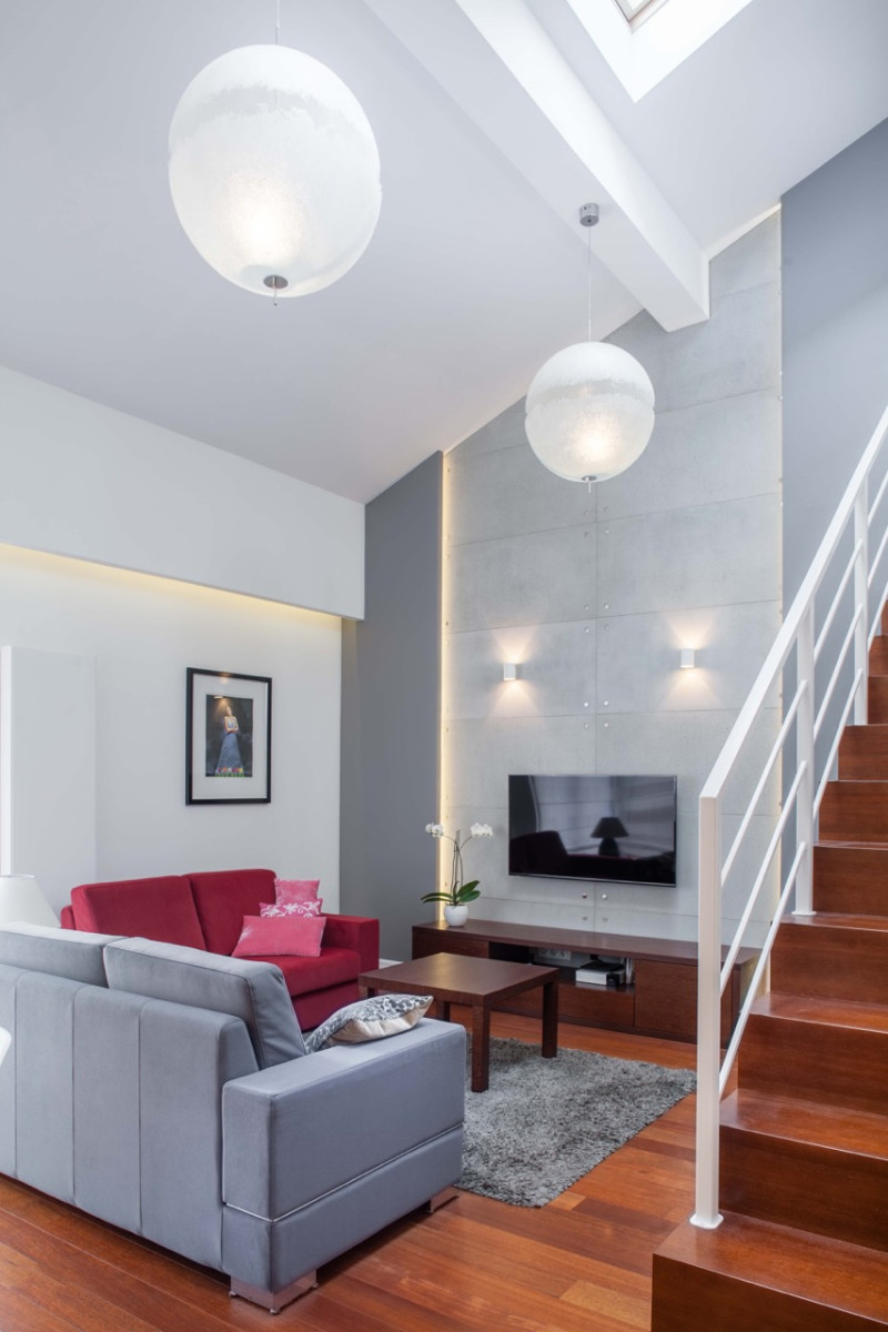 Komfortowy wypoczynek w gronie bliskich i znajomych zapewniają zaś dwie sofy w salonie dobrane w dwóch kontrastowych kolorach. Ciemna szarość i czerwień tapicerki przywołują na myśl inspiracje japońskim minimalizmem, subtelnie nawiązując do wybarwienia użytych tu materiałów – betonu i palisandru. Poświadcza to ich układ domykający optycznie przestrzeń. Dzięki temu przestrzeń, choć otwarta, jest funkcjonalnie uporządkowana i klarowna. Funkcje poszczególnych pomieszczeń są jasno wyznaczone i nie przenikają się, choć wizualnie tworzą jedną spójną całość. Jak przystało na minimalizm ilość elementów wyposażenia została ograniczona do minimum, a zbędne dekoracje zastępują wspomniane już różnorodne materiały, kolory i wykończenia, które wzajemnie się uzupełniają.