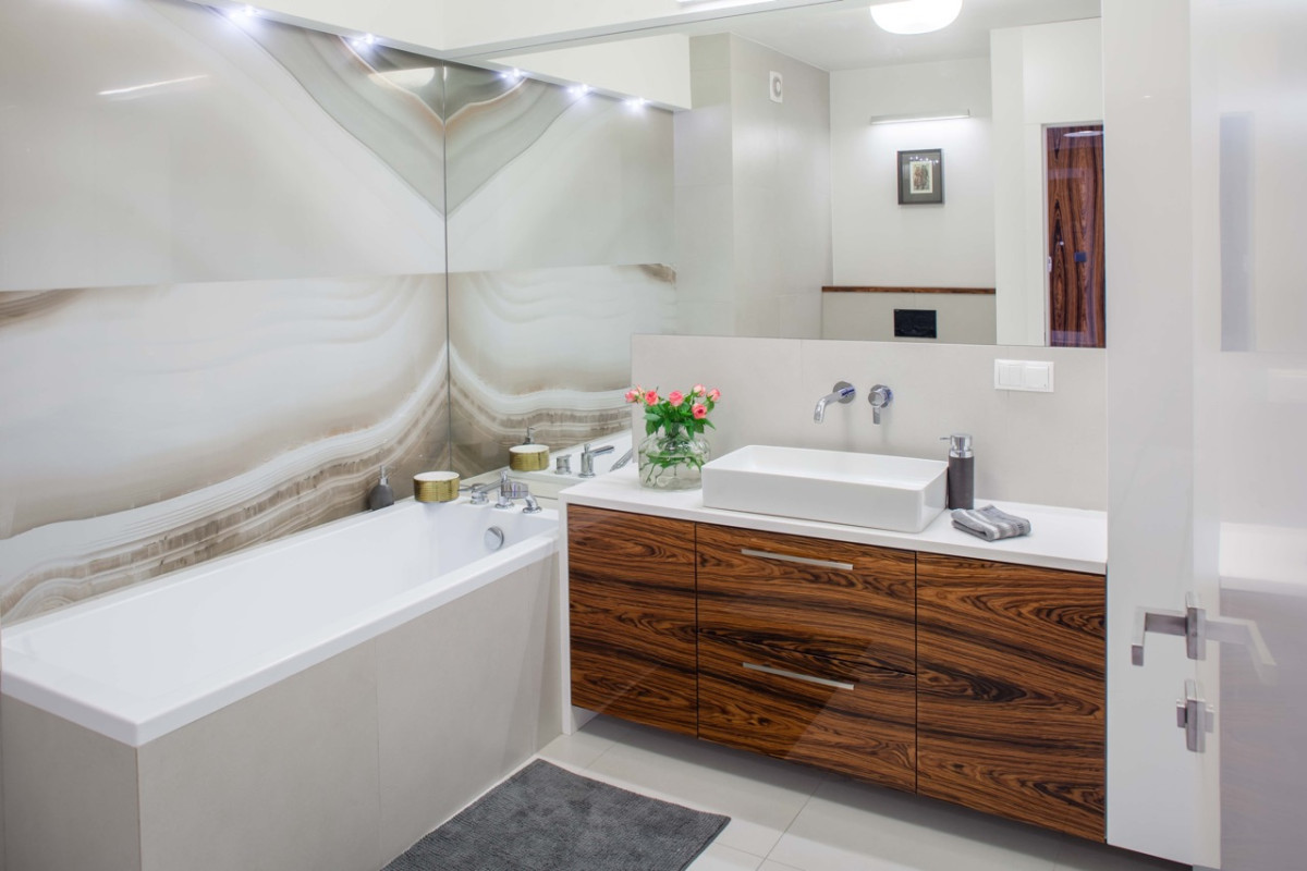 Stąd też w łazience pojawia się dekoracyjny kamień, który nadaje temu pomieszczeniu charakter domowego SPA. Łazienka to bowiem miejsce, w którym chcemy wypocząć i się zrelaksować. Architekt Anna Łuksza, będąc konsekwentną w każdej decyzji projektowej, nie mogła więc pominąć tej ważnej obecnie funkcji. Ocieplony drewnem, otulony bielą i jasnymi szarościami salonik kąpielowy stanowi wizualnie spójną z wszystkimi pomieszczeniami w domu, a przede wszystkim funkcjonalną przestrzeń zaprojektowaną by żyć wygodniej.