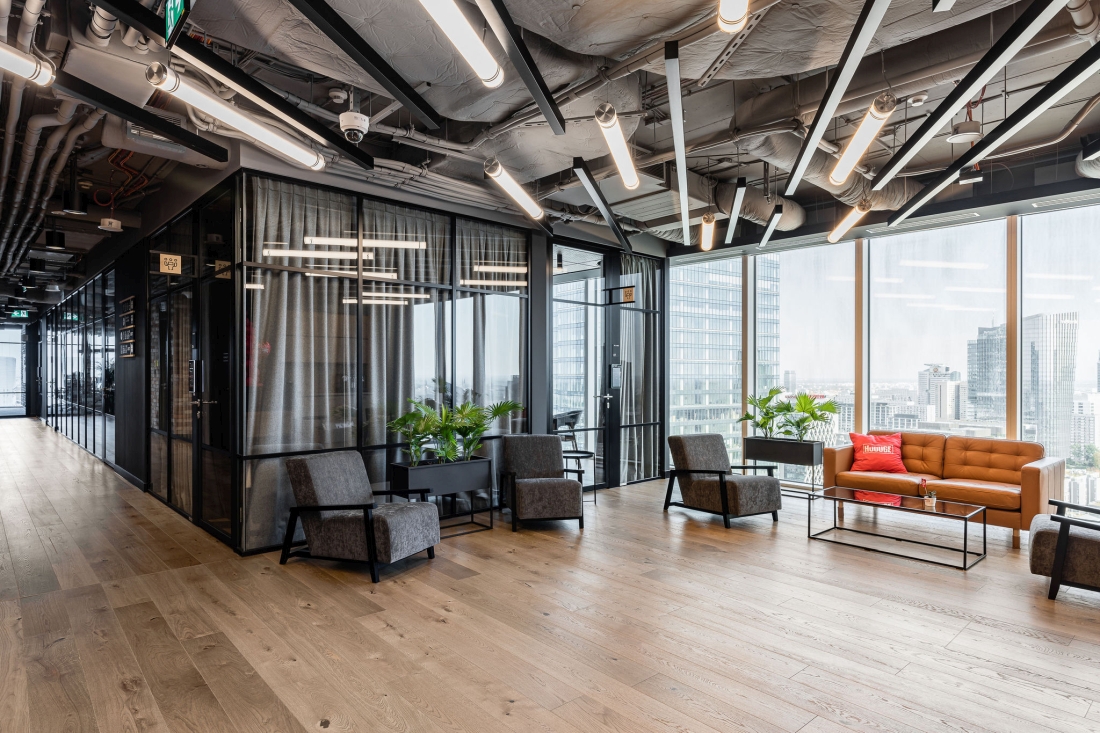 – Projektując biuro dla firmy Huuuge Games ważne było dla nas uzyskanie ciepłego wnętrza i przytulnej atmosfery w loftowym klimacie. Postawiliśmy na charakterystyczne elementy, takie jak ścianki szklane ze szprosami, drewno, cegłę czy techniczne sufity z industrialnymi oprawami. Dodatkowym atutem przestrzeni jest samoobsługowy punkt kawiarniany, w którym oczekujący mogą nie tylko poczęstować się kawą, ale również podziwiać piękną panoramę Warszawy – mówią autorzy projektu.