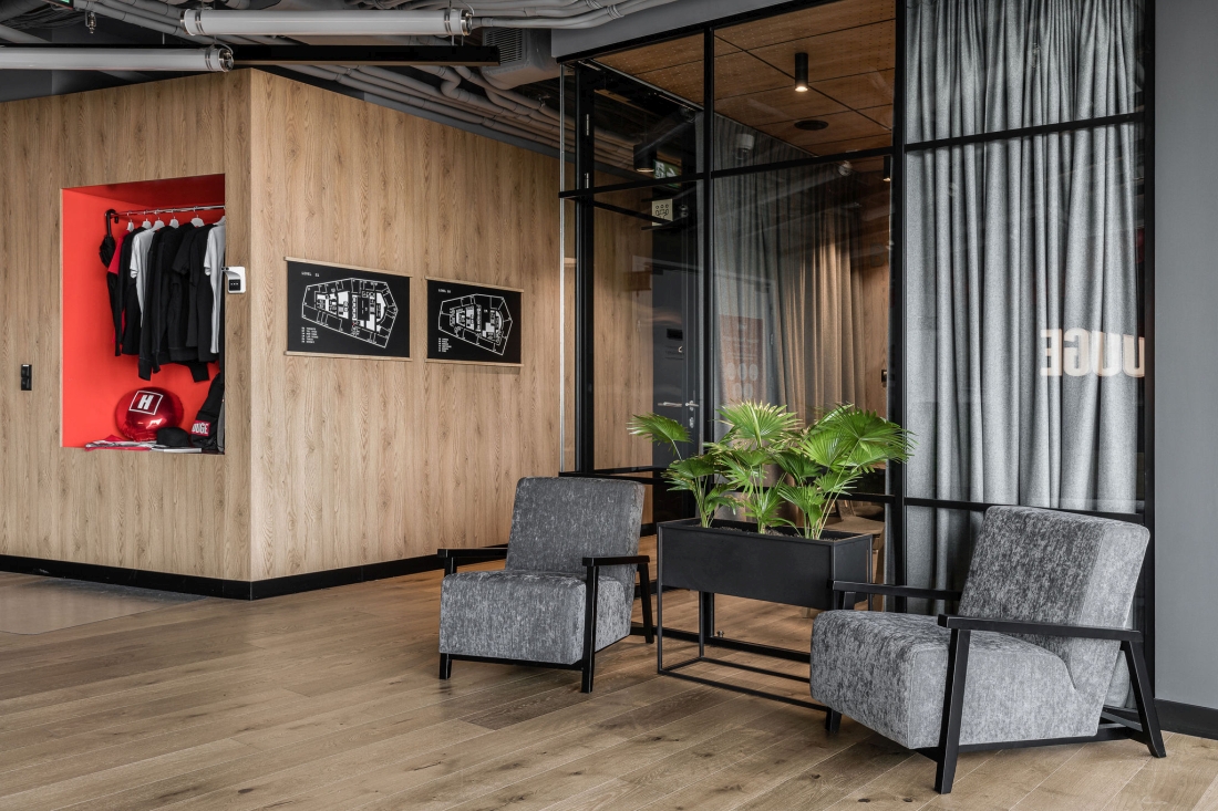 Sercem biura jest jednak przestrzeń socjalna, zaaranżowana tak, by w pełni odzwierciedlać wspomniane już motto firmy – „grajmy razem”. Poza dobrze wyposażoną kuchnią, odnajdziemy tu miejsce do wspólnych posiłków, ale też i tych w bardziej kameralnym gronie, przestrzeń do wypoczynku i zabawy, jak np. stół do bilardu. Urządzona w industrialnym klimacie, nie pozbawiona jest jednak ciepłych akcentów, które budują przytulny, sprzyjający zacieśnianiu relacji klimat. Cegła, drewno i żywa zieleń zmiękczają surową w odbiorze aranżację. Główną rolę pełnią jednak detale.