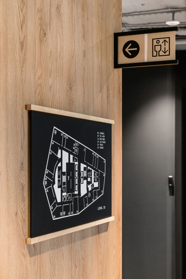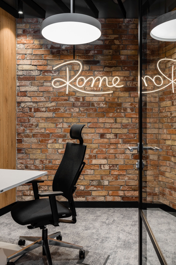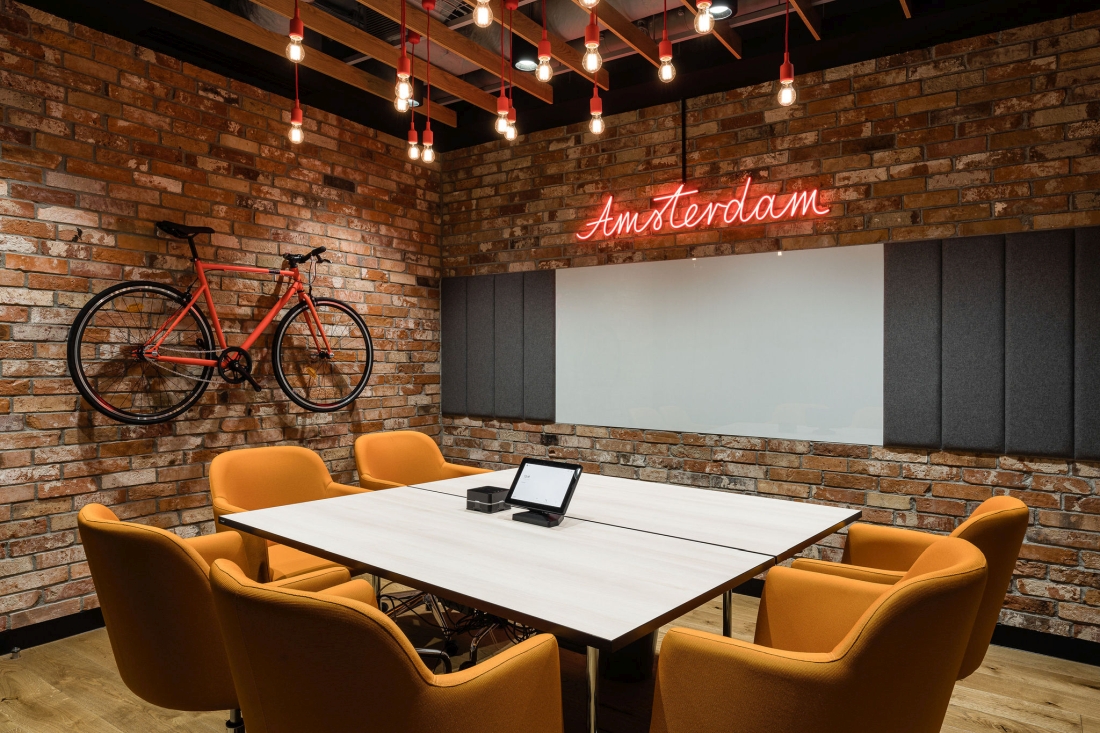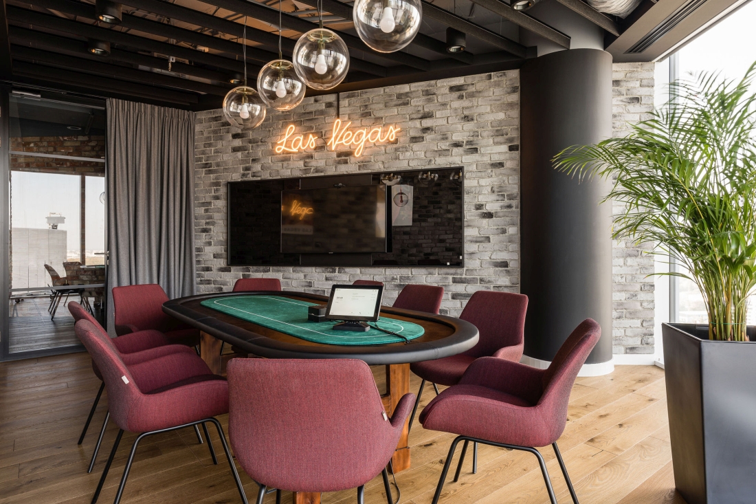 Wybór padł na nazwy miast, w których zlokalizowane są oddziały firmy. Las Vegas, gdzie mieści się centrala, Amsterdam, Londyn, Rzym to niektóre z nich. Każdy został urządzony tak, by w symboliczny sposób nawiązać do ikonicznego charakteru miasta, pozostając jednak w klimacie soft-loftu. Stąd w salce Las Vegas centralne miejsce zajmuje stół inspirowany stołami dla graczy w kasynie. W pokoju Amsterdam uwagę przyciąga powieszony na ścianie rower, w Roma – charakterystyczne dla tamtejszej architektury cegła w ciepłym wybarwieniu, a w London – chłodna, betonowa stylistyka inspirowana tamtejszym metrem. Wszystkie przestrzenie posiadają też neon z nazwą sali.