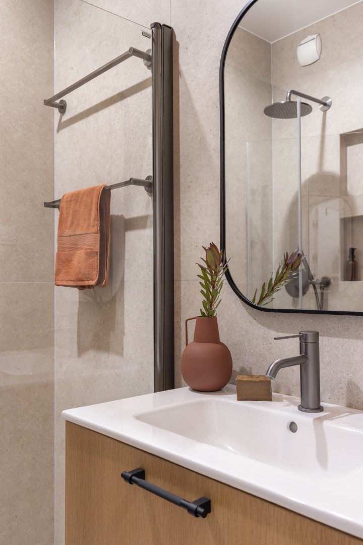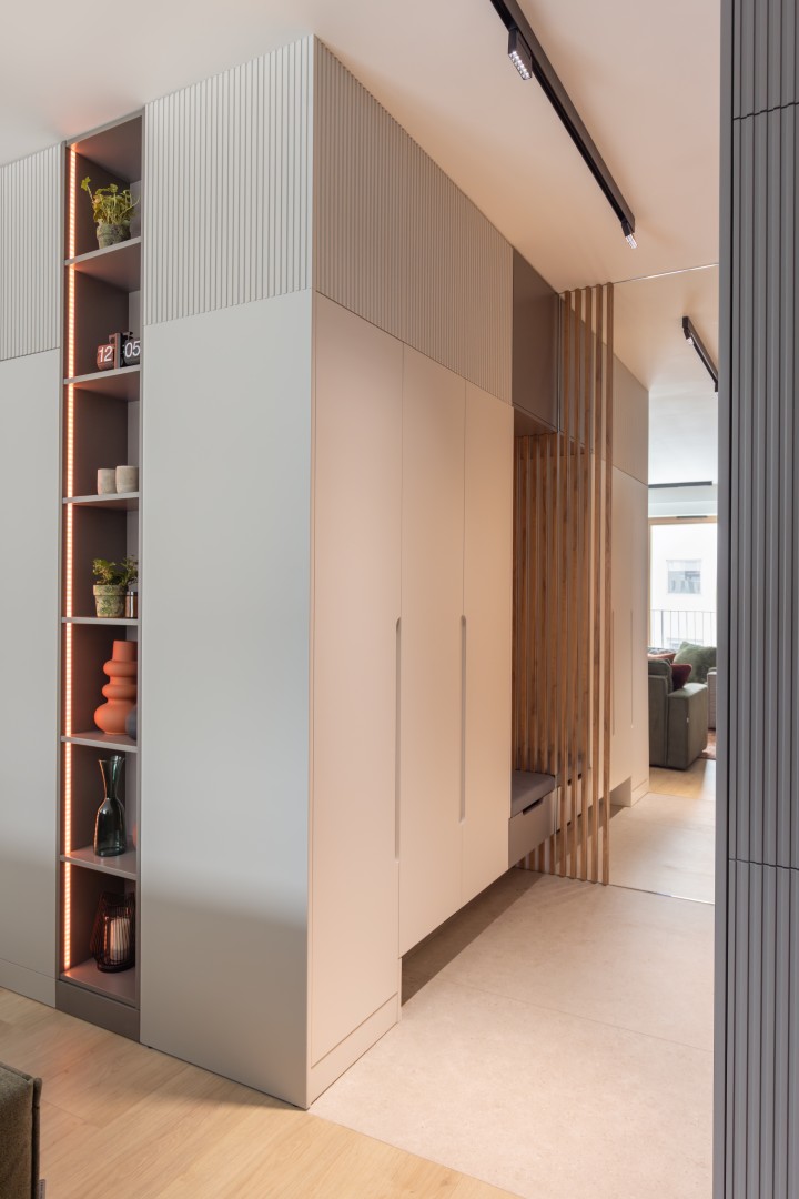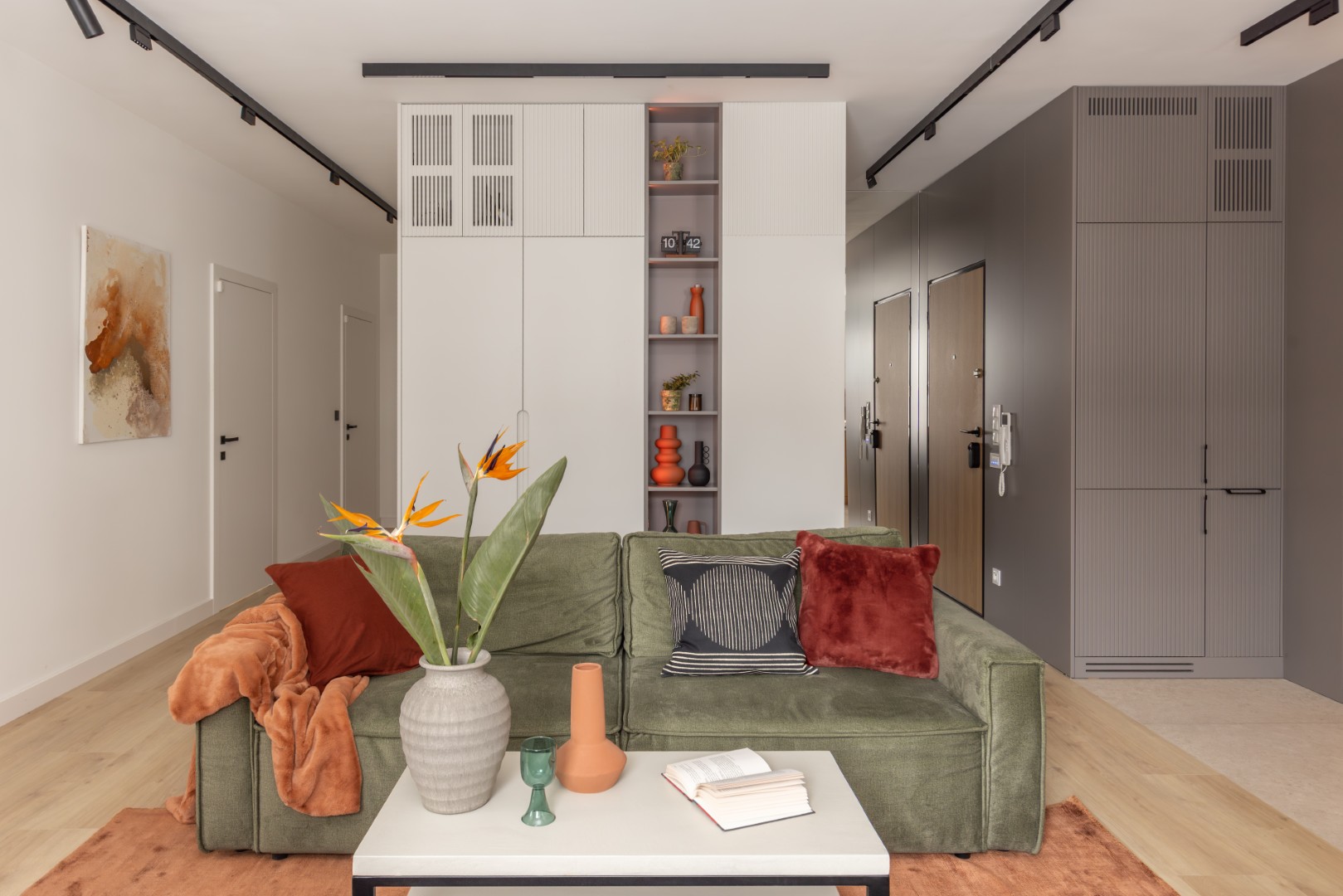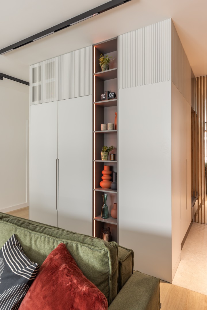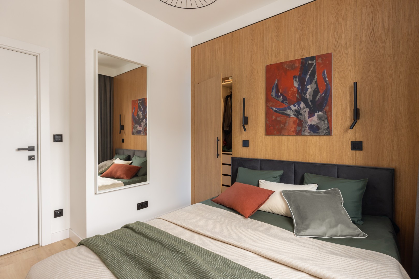 Centralną częścią mieszkania jest przestrzeń dzienna obejmująca hol, salon z aneksem kuchennym oraz pokój gościnny. Dzięki wyburzeniu ściany i zastosowaniu industrialnego przeszklenia pokój gościnny pełni jednocześnie trzy funkcje: sypialni, jadalni i przestrzeni do gier VR lub ćwiczeń. Mięsista zasłona pozwala zachować prywatność nocującym gościom, a zastosowanie mebli rozkładanych sprawia, że powstała przestrzeń jest o wiele bardziej funkcjonalna. Każdy z braci posiada własną strefę prywatną z sypialnią, gabinetem, garderobą i łazienką, co zapewnia autonomię i komfort w codziennym życiu. Nietypowym elementem jest brak telewizora w salonie. Zamiast niego zastosowano bezprzewodowy rzutnik wyświetlający obraz na sufit, co pozwala oglądać filmy na leżąco, tworząc wyjątkowe doświadczenie wizualne. Zuzanna Woźniak z WOZ.design wprowadziła również nowoczesne rozwiązania smart home, m.in. system LED w przedpokoju, informujący np. o pełnym koszu na śmieci, czy LED nad drzwiami gabinetów sygnalizujący obecność mieszkańców na callu.