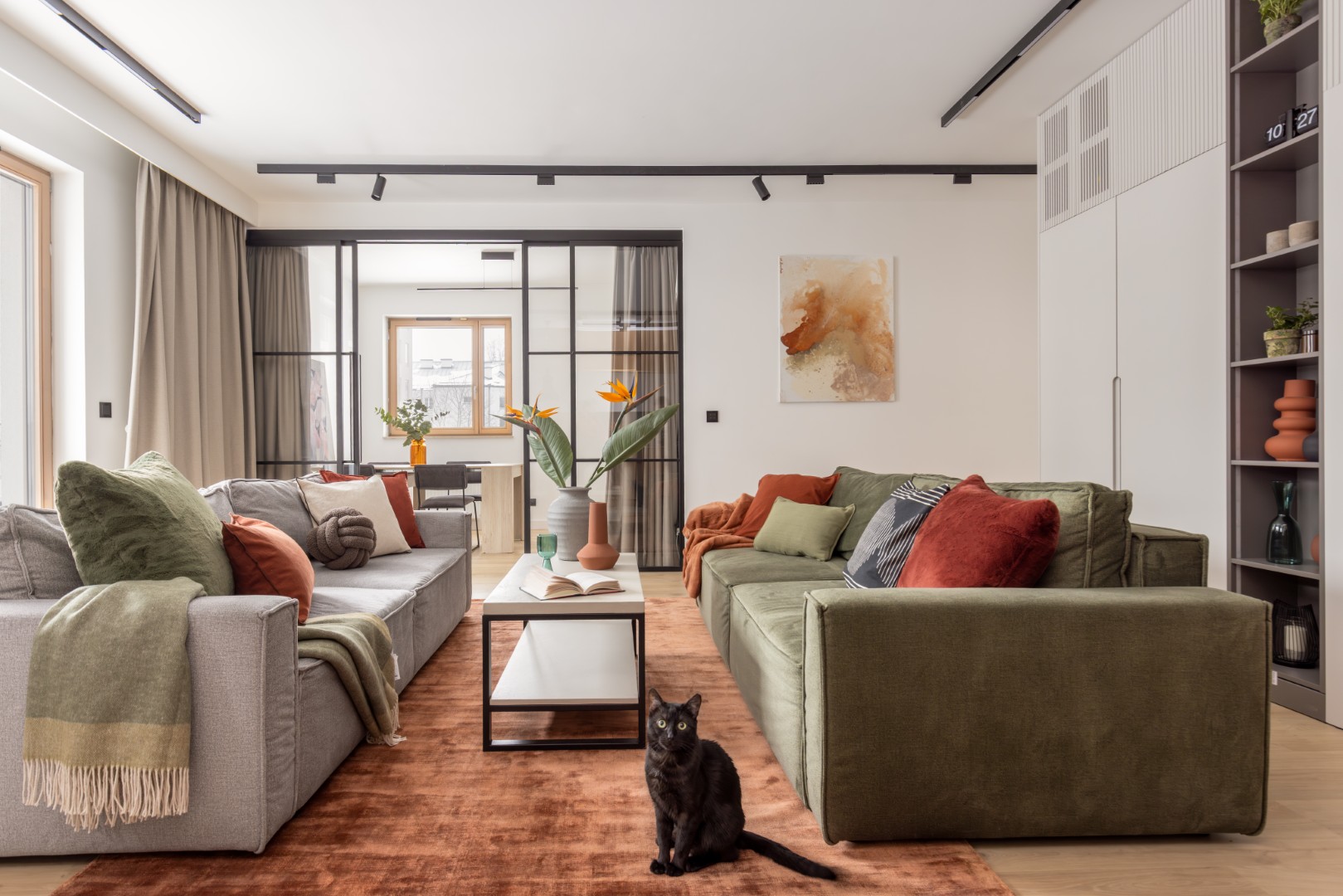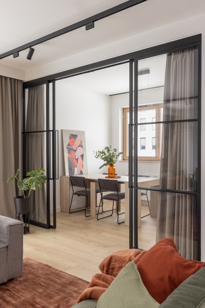 Wnętrze mieszkania utrzymane jest w stylu industrialnym, inspirowanym charakterem okolic pobliskiego Dworca Zachodniego. Dominują tu stalowe przeszklenia, industrialne lampy i detale takie jak dworcowy zegar na regale. Bazowa kolorystyka jest spokojna i neutralna, przełamana subtelnymi, kolorowymi akcentami, które ocieplają przestrzeń i dodają jej przytulności.