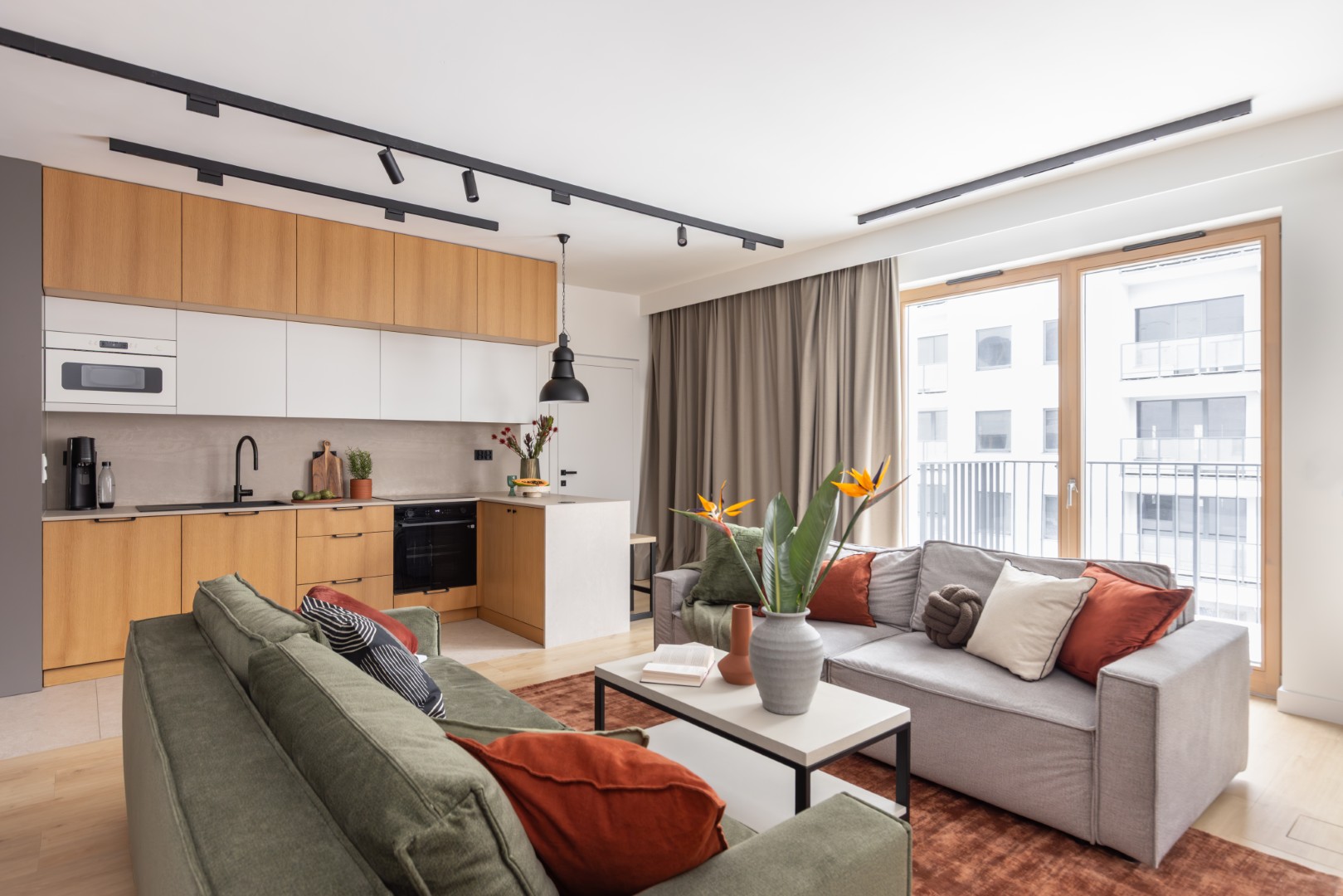 W projektowanym mieszkaniu wykorzystano wysokiej jakości materiały: fornir dębowy, lakierowane fronty z ryflowaniami, blaty z konglomeratu, płytki Atlas Concorde oraz panele podłogowe Terhurne, wybrane z myślą o planowanych w domu zwierzętach. Meble pochodzą od IWC Home, Lenart Meble i VOX, a dodatki, takie jak dywany Carpets & More, przeszklenia Ferwor czy oświetlenie Maxlight, Nowodvorski i Italux, podkreślają spójność stylistyczną wnętrza.