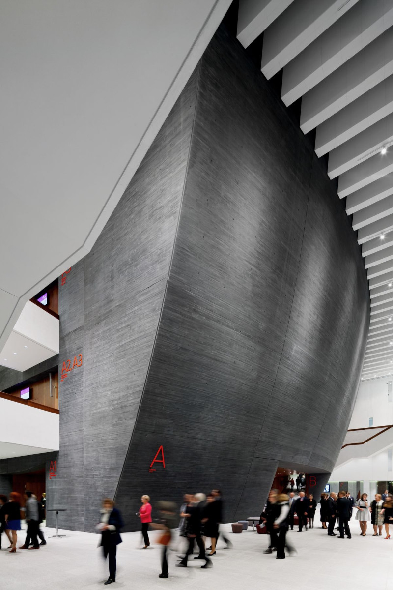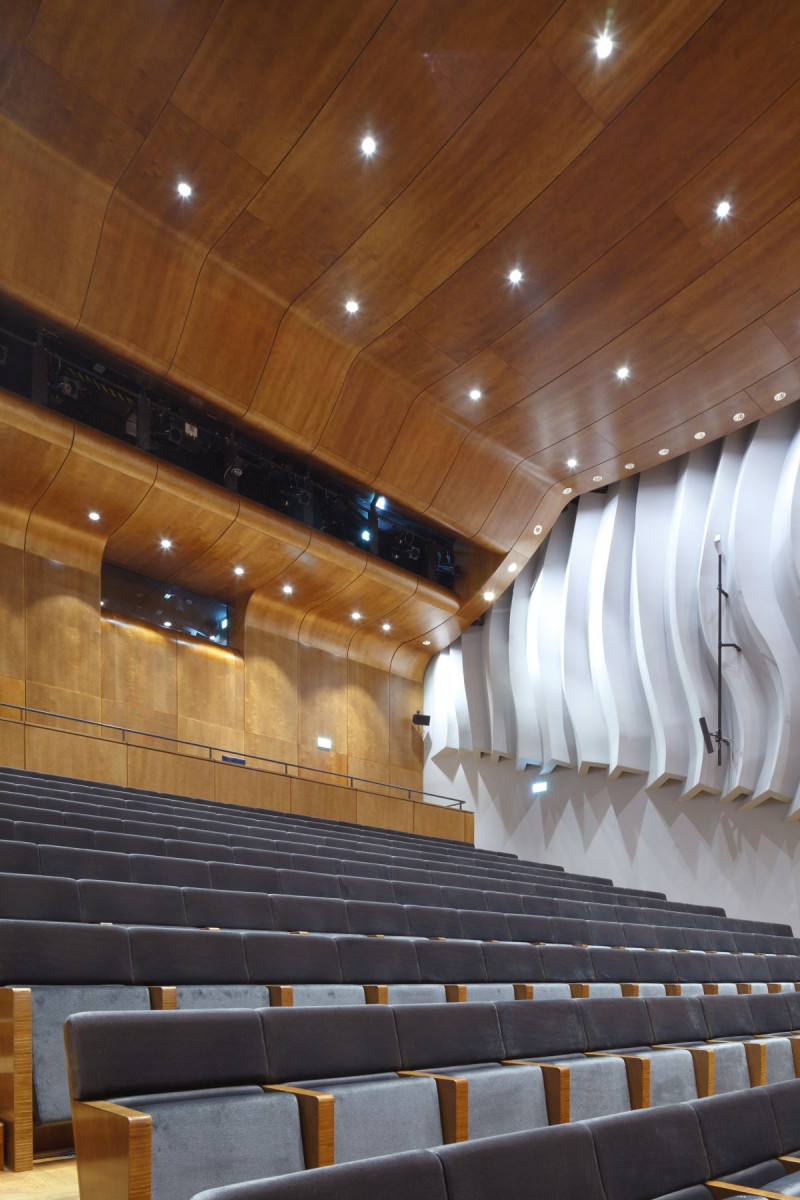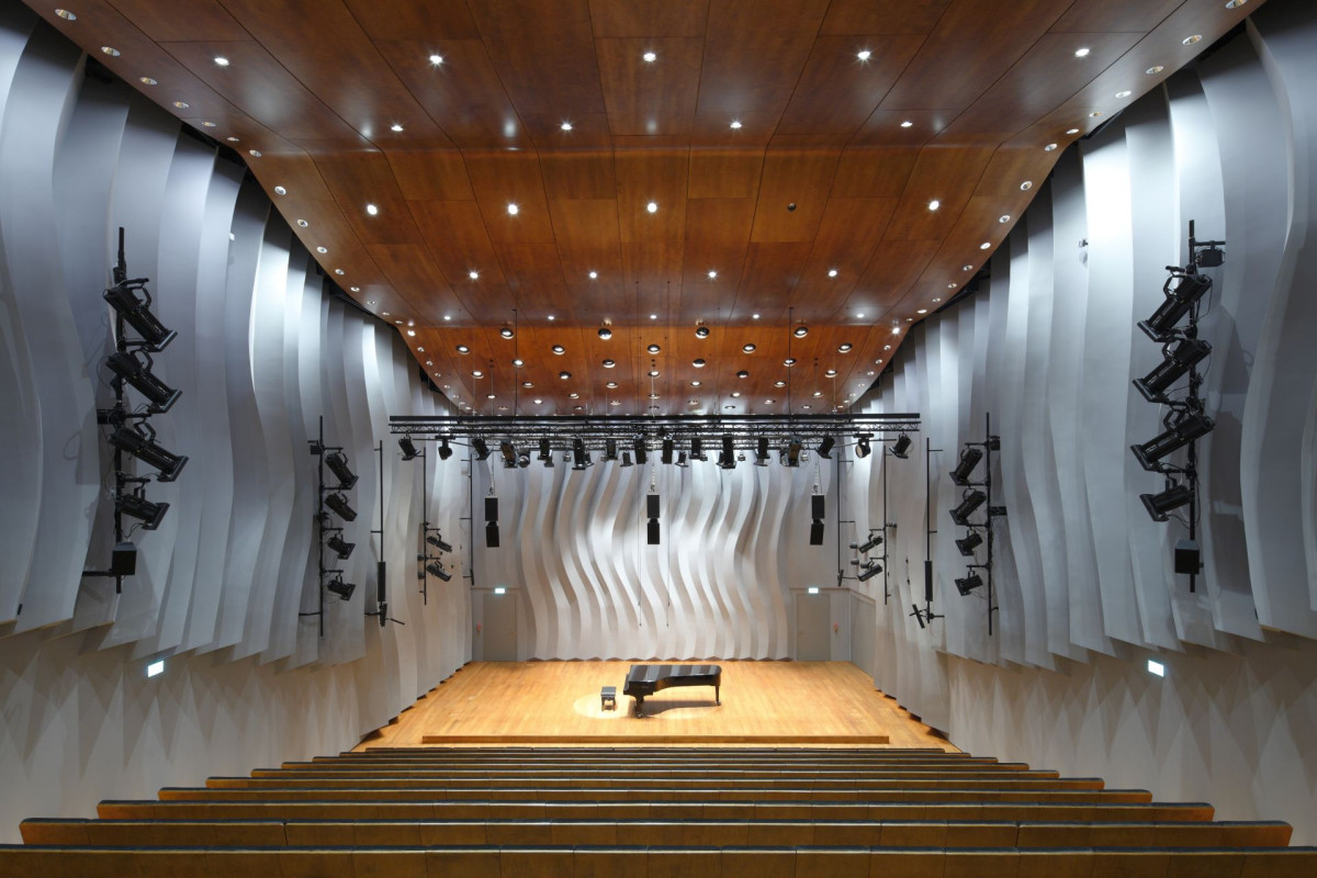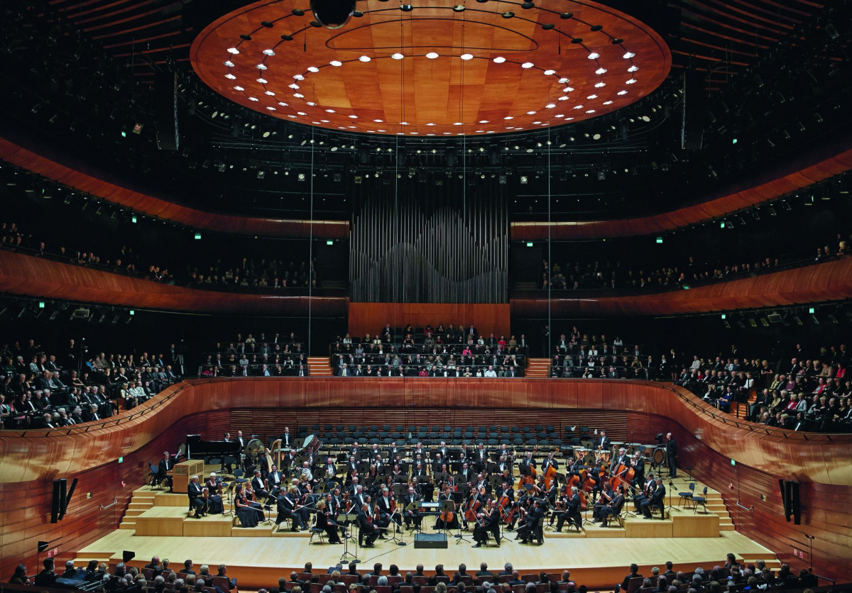Wewnątrz zaprojektowano bogaty program funkcjonalny. Składają się na niego trzy oddzielne, choć współzależne strefy – pierścień, atrium i sala koncertowa. Zewnętrzny budynek, przypominający swym kształtem ramę, został zaprojektowany z myślą o potrzebach orkiestry. Wśród ponad 400 pomieszczeń znalazły się m.in. sala kameralna, sale prób i garderoby. Z kolei melomani korzystają z przestrzeni wokół sali koncertowej. Centralnym punktem budynku jest sala koncertowa przewidziana na 1800 osób, zamknięta wewnątrz potężnej betonowej bryły. Jej wygląd przywodzi na myśl wnętrze olbrzymiego instrumentu muzycznego. I faktycznie – została ona zainspirowana skrzypcami Stradivariusa, ich finezyjnym kształtem i niepowtarzalnym połyskiem. Mimo wielości użytych materiałów składają się one w harmonijną całość, tworząc niepowtarzalną atmosferę i wyjątkową akustykę.