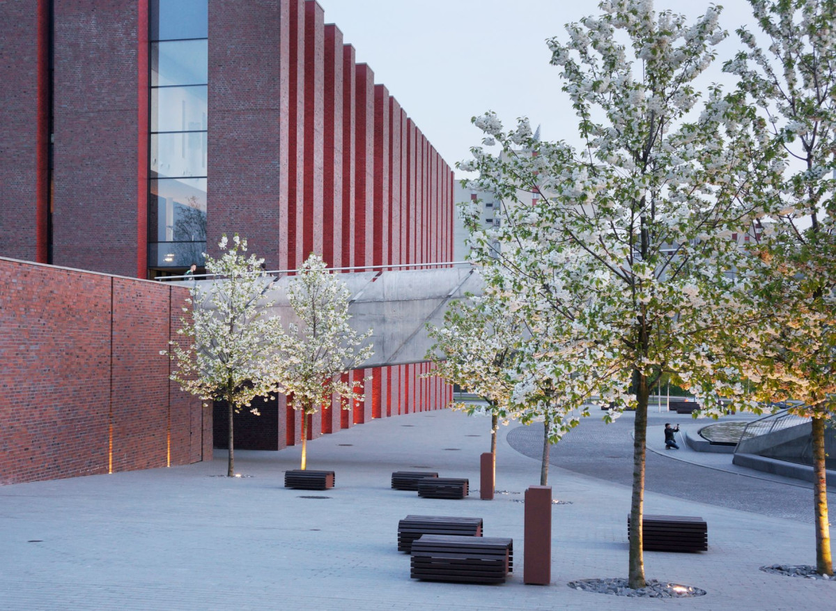 Za sprawą wielowarstwowej struktury gmach orkiestry łączy się i przenika z otoczeniem, które – według koncepcji autorów projektu – ma służyć mieszkańcom miasta. Nic dziwnego, że wokół niego powstały liczne ogrody, place z fontannami, labirynt oraz amfiteatr, które stworzyły przestrzeń do odpoczynku i popołudniowego relaksu.