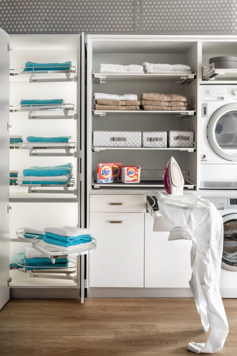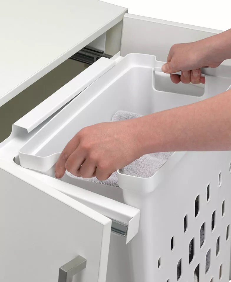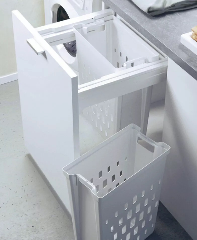 Wysuwany mechanizm z prowadnicami Nova Pro Scala Grass i funkcją Soft-Close gwarantuje ciche, płynne działanie, a gładka, biała powierzchnia pojemników ułatwia utrzymanie higieny. To rozwiązanie szczególnie docenią rodziny z dziećmi, gdzie prania jest dużo i porządek musi iść w parze z wygodą.