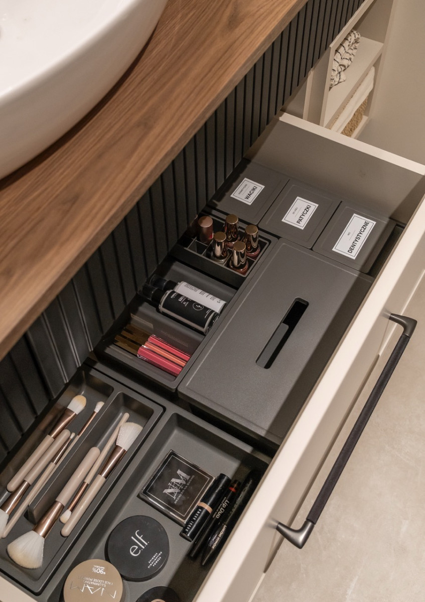 Wkład do szuflady umywalkowej od Peka rozwiązuje ten problem – specjalnie wyprofilowany wkład omija syfon, a jednocześnie dzieli przestrzeń na wygodne przegródki.