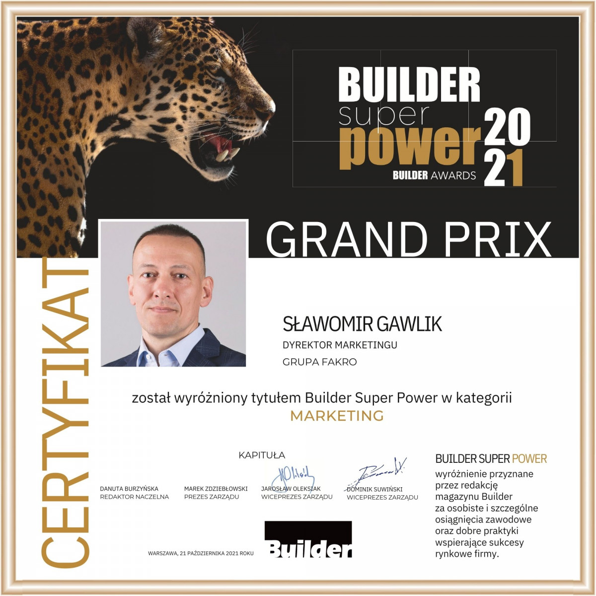 Sławomir Gawlik – Dyrektor Marketingu Grupy FAKRO został uhonorowany przez miesięcznik „Builder” nagrodą Super Power. Podczas specjalnej uroczystości, która odbyła się 21 października 2021 roku w „Bank Clubie” w Warszawie, laureat otrzymał Certyfikat Builder Super Power.