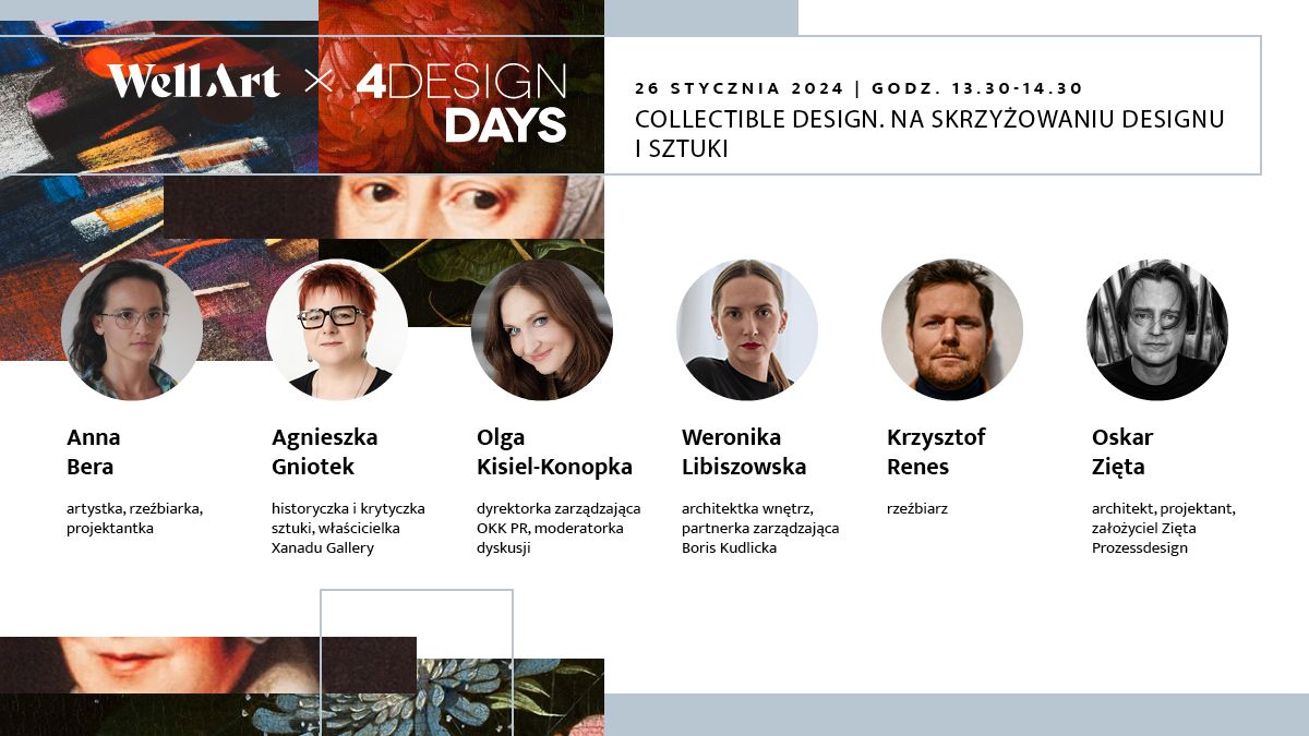 O spotkaniu designu ze sztuką dyskutować będą uczestnicy 4 Design Days, a wśród nich: Anna Bera, artystka, rzeźbiarka, projektantka; Agnieszka Gniotek, krytyk sztuki, właścicielka XANADU Galeria I Dom Aukcyjny; Weronika Libiszowska, architektka wnętrz, partnerka zarządzająca w pracowni Boris Kudlička with Partners; Krzysztof Renes, rzeźbiarz.