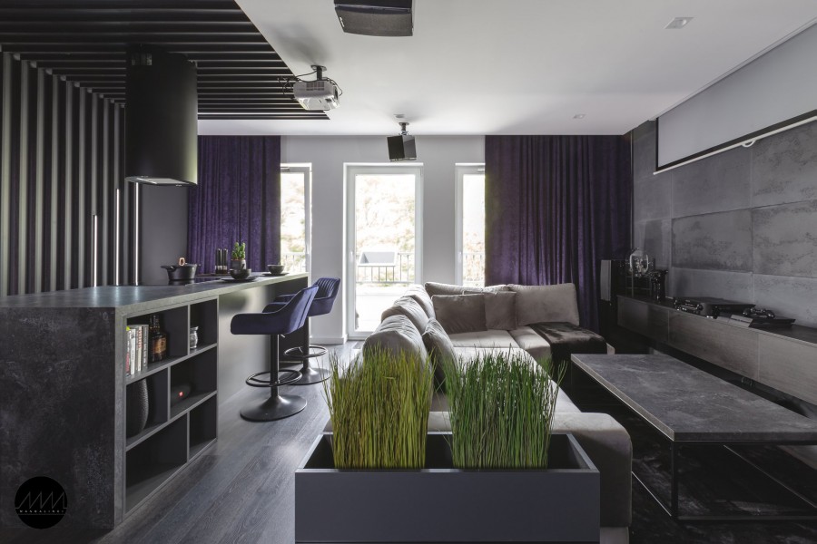 W projektowanym mieszkaniu króluje szarość podana w najliczniejszych odcieniach. Beton architektoniczny, którym ozdobiona została ściana salonu, koresponduje z szarymi panelami podłogowymi. Do tego zaproponowane zostało wykończenie wyspy kuchennej czy stolika w postaci płyt o rysunku kamienia. Uzupełnieniem jest głęboka purpura, którą oblane zostały ciężki i grube zasłony w oknie strefy dziennej. Fiolet pokrył także obicia hokerów. W sypialni barwę tą zastąpiły przygaszone odcienie brązów, które rozsiadły się wygodnie na łóżku, a także w jego sąsiedztwie.