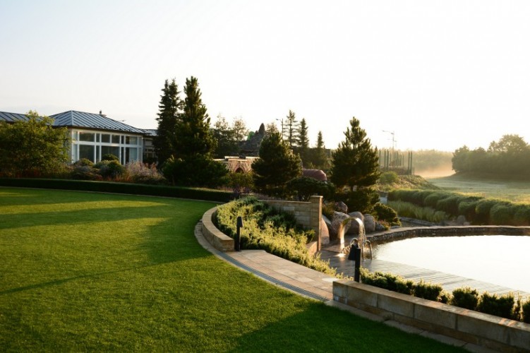 Ogród udało się subtelnie wtopić w krajobraz poprzez rezygnację z widocznego ogrodzenia, a także wykorzystanie gatunków roślin, które nawiązują do roślin otaczających działkę. Sprzyjają temu również liczne, naturalistyczne rabaty bylinowe. Elementy wodne stanowią charakterystyczne dla ogrodu obiekty – znajdziemy tutaj nie tylko zbiorniki, ale i ściany wodne, czy wspomniane wcześniej fontanny. Nadają one ogrodowi elegancji i klasycznego sznytu.