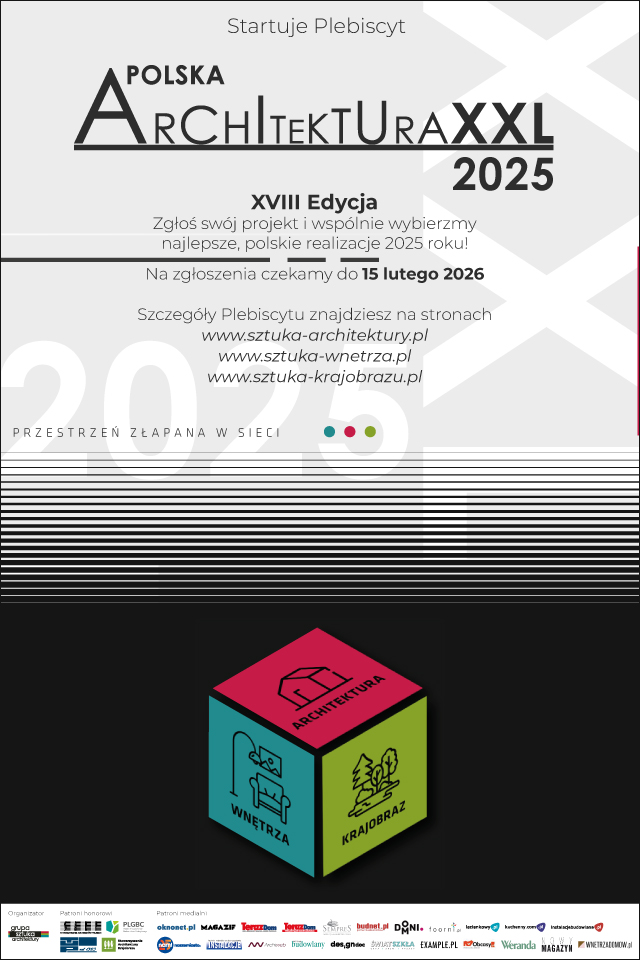 Redakcje serwisów sztuka-architektury.pl, sztuka-wnetrza.pl i sztuka-krajobrazu.pl od 19 stycznia do 15 lutego 2026 roku będą zbierały informacje o najciekawszych realizacjach publicznych i prywatnych w polskiej architekturze 2025 roku. Do Plebiscytu można także zgłaszać obiekty, które nie wzięły udziału w Plebiscycie Polska Architektura XXL 2024, a zostały oddane do użytku w 2024 roku.