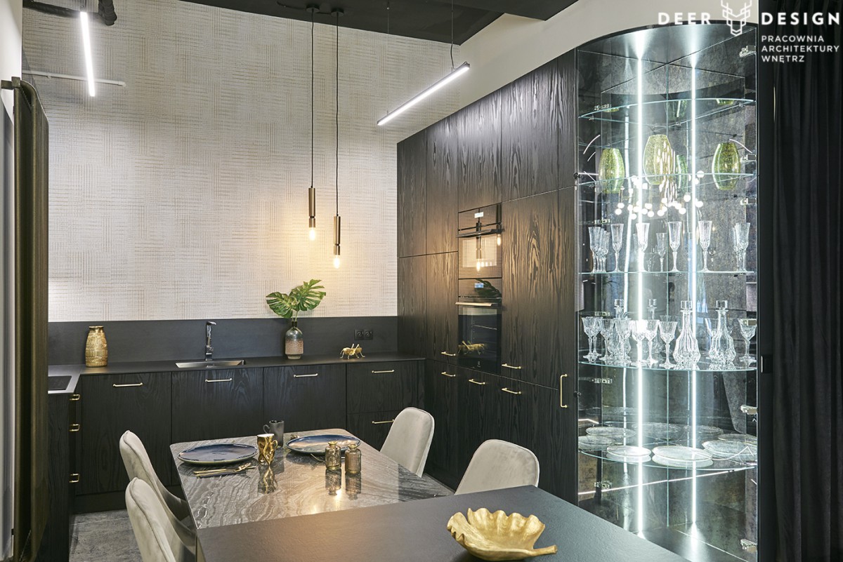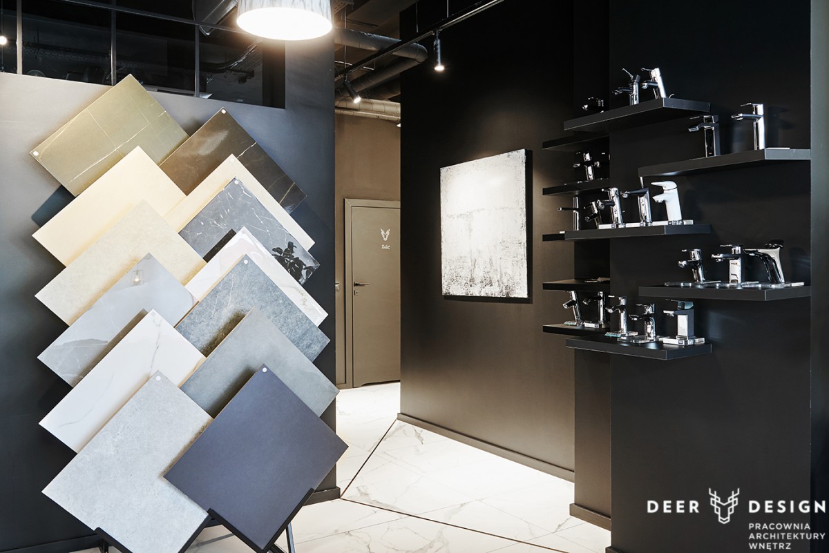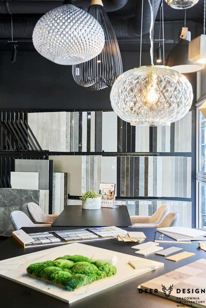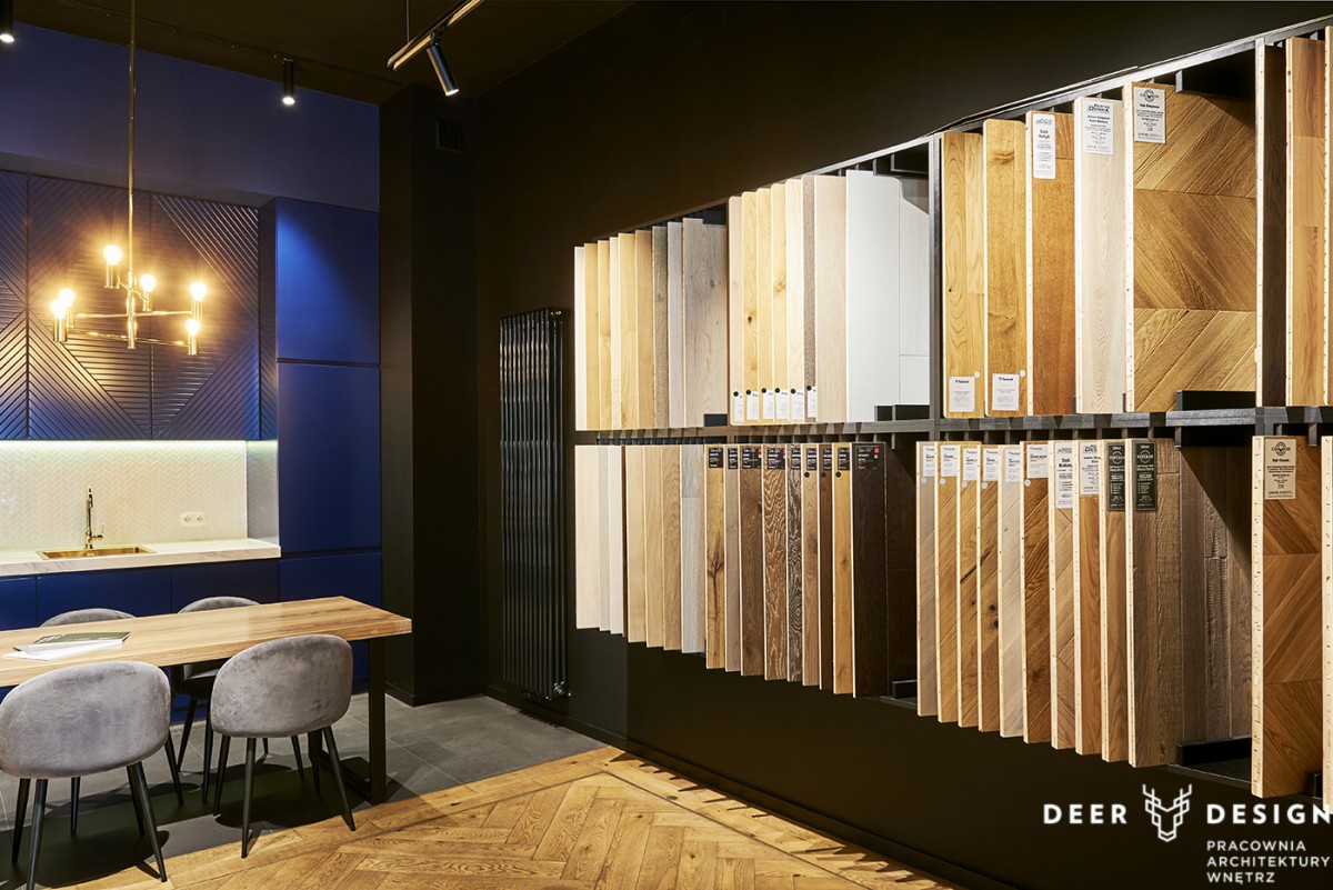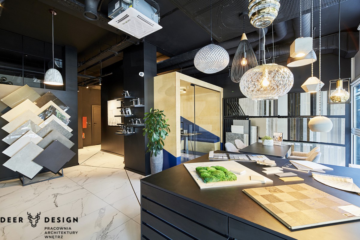 Ekspozycja to 250 m2 powierzchni wypełnionej materiałami i rozwiązaniami, które klient może zobaczyć i przetestować podczas wizyty w pracowni. Dwie, różne od siebie kuchnie, detale na ścianach, ekspozytory z drewnianymi podłogami, płytkami i ogromny wachlarz próbek farb, tapet czy kamieni. Wcześniejsi najemcy lokalu prowadzili tu fitness klub połączony z przestrzenią zabaw dla dzieci. Architektom z Deer Design zależało na wyznaczeniu stref. Od rozmowy przy stole, przejście przez przestrzenie pokazowe jak łazienka czy kuchnia, aż do miejsca gdzie swobodnie architekt może stworzyć moodboard z proponowanych dla klienta materiałów. Pierwsze wizualizacje pracowni to zachowawcze zabudowy kuchenne i stonowane kolory. Architekci jednak zdecydowali się pokazać niestandardowe rozwiązania takie jak kuchnia w niebieskim kolorze, frezowane fronty, wyspy kuchenne, czy funkcjonalne systemy szuflad. Klient może już na pierwszym spotkaniu zobaczyć to, co niesztampowe i pozbawione utartych schematów. Wszystkie te elementy wystroju tworzą swego rodzaju eklektyzm, dlatego w pracowni ściany pomalowane zostały na czarny kolor, który tworzy idealne tło do pokazania różnego rodzaju faktur i kolorów dostępnych materiałów. Jedynie w kuchni utrzymanej w ciemnej kolorystyce zastosowano ściany w jasnych kolorach dla pokazania kontrastów i spójności pomieszczeń. Każdy klient może poczuć się tu wyjątkowo i wraz z architektem odbyć przyjemny spacer po wszystkich pomieszczeniach.