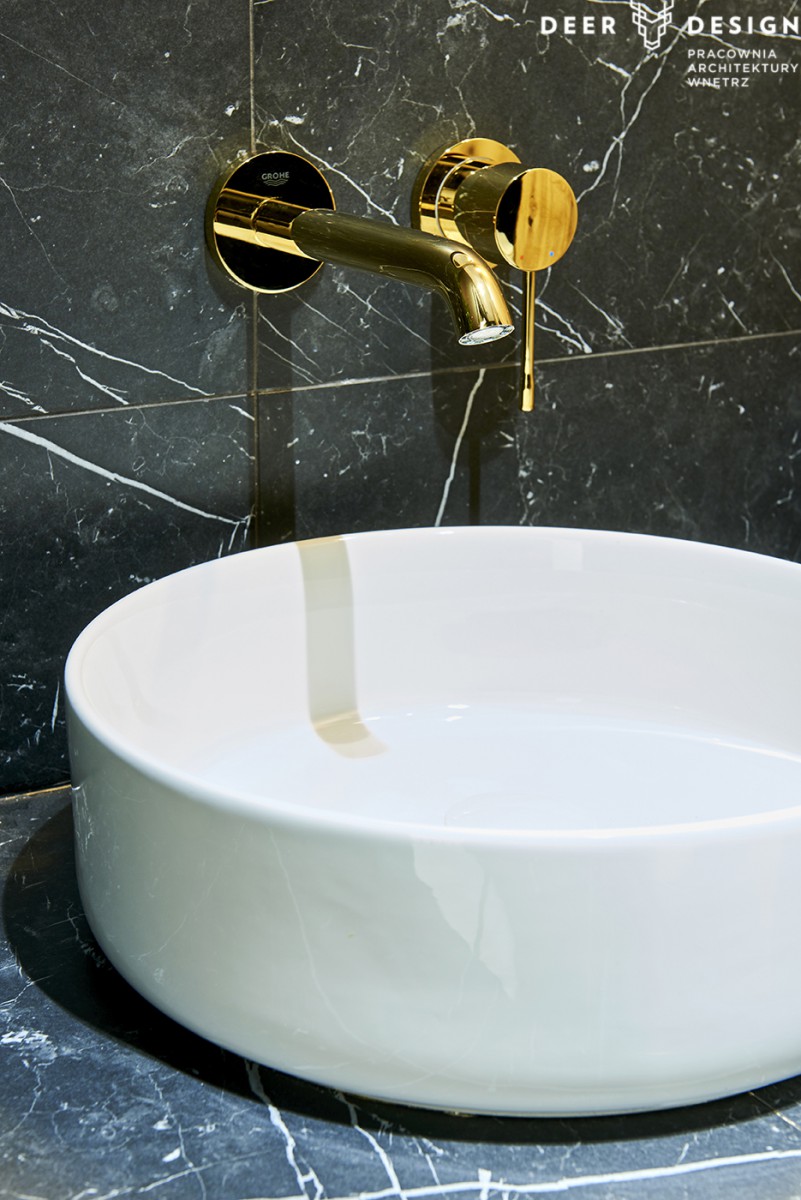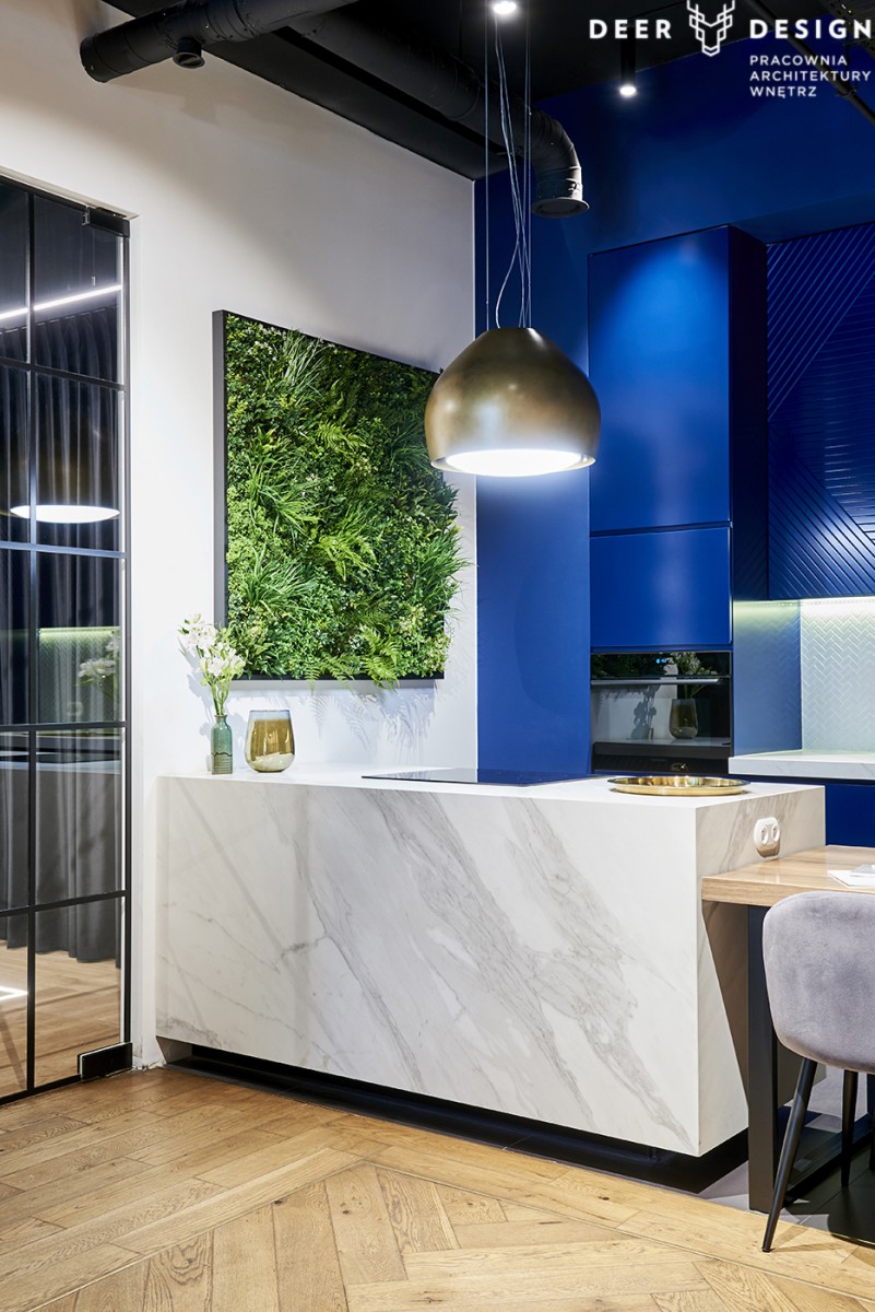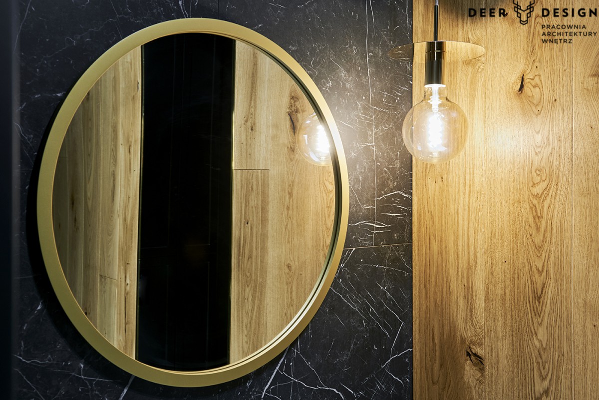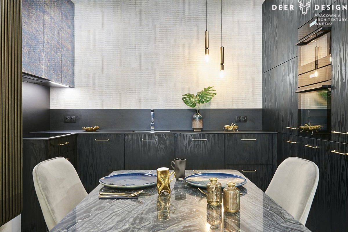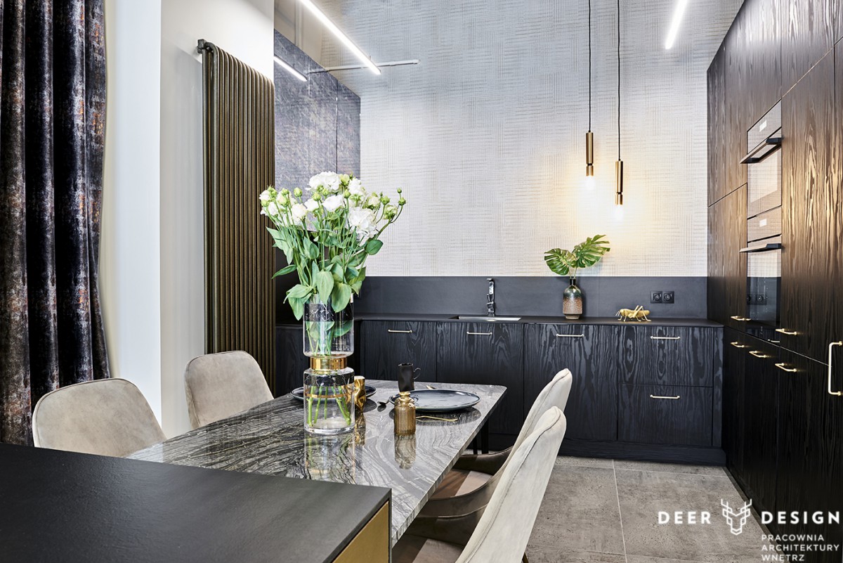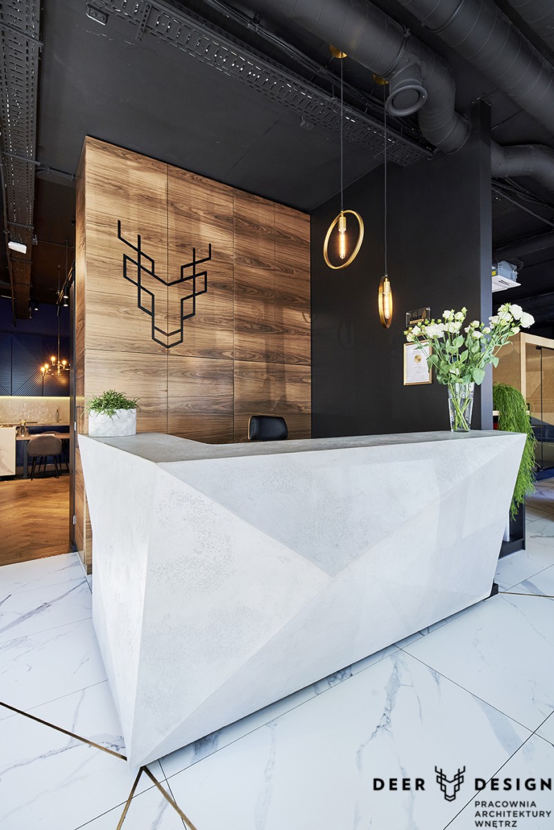 Ekspozycja to 250 m2 powierzchni wypełnionej materiałami i rozwiązaniami, które klient może zobaczyć i przetestować podczas wizyty w pracowni. Dwie, różne od siebie kuchnie, detale na ścianach, ekspozytory z drewnianymi podłogami, płytkami i ogromny wachlarz próbek farb, tapet czy kamieni. Wcześniejsi najemcy lokalu prowadzili tu fitness klub połączony z przestrzenią zabaw dla dzieci. Architektom z Deer Design zależało na wyznaczeniu stref. Od rozmowy przy stole, przejście przez przestrzenie pokazowe jak łazienka czy kuchnia, aż do miejsca gdzie swobodnie architekt może stworzyć moodboard z proponowanych dla klienta materiałów. Pierwsze wizualizacje pracowni to zachowawcze zabudowy kuchenne i stonowane kolory. Architekci jednak zdecydowali się pokazać niestandardowe rozwiązania takie jak kuchnia w niebieskim kolorze, frezowane fronty, wyspy kuchenne, czy funkcjonalne systemy szuflad. Klient może już na pierwszym spotkaniu zobaczyć to, co niesztampowe i pozbawione utartych schematów. Wszystkie te elementy wystroju tworzą swego rodzaju eklektyzm, dlatego w pracowni ściany pomalowane zostały na czarny kolor, który tworzy idealne tło do pokazania różnego rodzaju faktur i kolorów dostępnych materiałów. Jedynie w kuchni utrzymanej w ciemnej kolorystyce zastosowano ściany w jasnych kolorach dla pokazania kontrastów i spójności pomieszczeń. Każdy klient może poczuć się tu wyjątkowo i wraz z architektem odbyć przyjemny spacer po wszystkich pomieszczeniach.