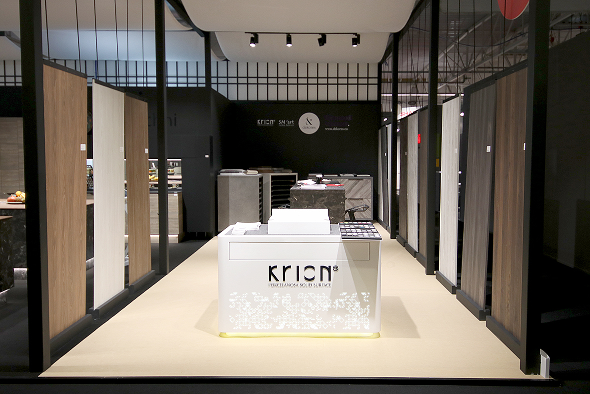 KRION to z kolei ekologiczny materiał Solid Surface najnowszej generacji, stworzony przez firmę należącą do Porcelanosa Group. Do złudzenia podobny do kamienia, jest jednocześnie ciepły w dotyku, łatwy w utrzymaniu w czystości, a także – w obróbce. Umożliwia tworzenie fantazyjnych projektów mebli i całych zabudów, bez widocznych spoin. Dostępny jest w wielu kolorach i wymiarach.