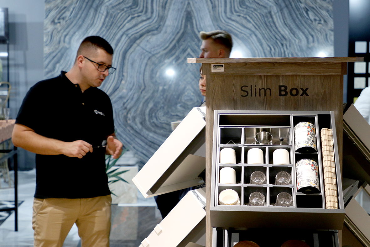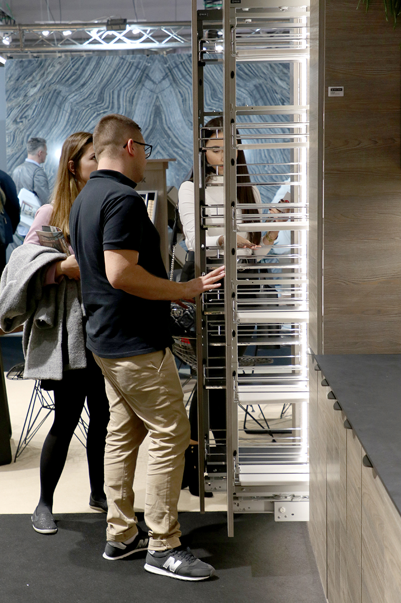 Podstawę ekspozycji podczas Warsaw Home stanowiły sprawdzone systemy szuflad, kornery i cargo do szafek dolnych i wysokich. Na uwagę zasługiwały nowe systemy organizacji Slim Box i Comfort Box, nowe warianty szuflad wewnętrznych, odświeżone wykończenia i rozwiązania techniczne. Dużym zainteresowaniem cieszyły się również mechanizmy do szafek narożnych – wysuwane kosze i półki pozwalające na lepsze wykorzystani przestrzeni do przechowywania.