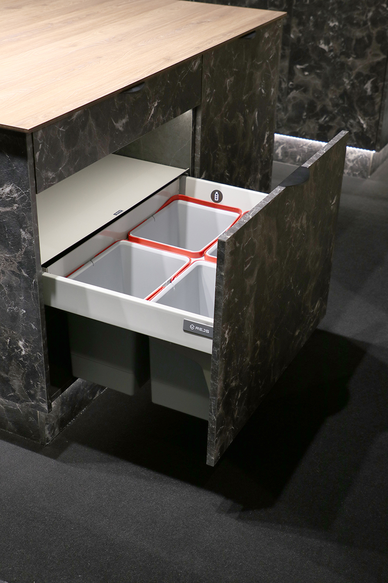 Firma REJS duży nacisk położyła również na systemy do segregacji odpadów. Świadomość potrzeby poddawania recyklingowi jak największej ilości odpadów jest coraz większa, dlatego oferta odpowiednich rozwiązań została znacząco poszerzona. Domową selekcję ułatwią wysuwane zestawy pojemników o zróżnicowanej pojemności, szczelnych pokrywach i czytelnych oznaczeniach. Ich liczbę i sposób rozmieszania wybrać może sam użytkownik w zależności od swoich potrzeb i przyzwyczajeń. Bogaty wyborów systemów jezdnych i sposobów mocowań pozwoli dopasować system do rodzaju zabudowy.