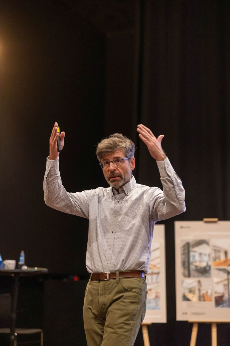 Wypowiedź profesora Bralczyka – niekwestionowanego autorytetu, niestrudzonego popularyzatora wiedzy o języku, jak również arbitra w kwestiach poprawności mówionego i pisanego słowa – popłynęła wartkim strumieniem, który porwał i poniósł słuchaczy chłonących w milczeniu jego słowa wprost z przestrzeni. Po tym wielowątkowym, skrzącym się swadą i humorem wstępie, który rozszerzył horyzonty, nie tylko jeśli chodzi o treści dostępne uchu (słowo słyszane), ale także wewnętrznemu, mentalnemu „słuchowi”, rozpoczęła się część stricte szkoleniowa. Wypełnili ją swoimi wartościowymi wystąpieniami Pascal van Dort, globalny ambasador ds. akustyki marki Rockfon, znawca tematu, człowiek o niezwykłej charyzmie i subtelnym poczuciu humoru, oraz dr hab. inż. arch. Andrzej Kłosak, wykładowca akademicki, profesor Politechniki Krakowskiej, niezależny konsultant akustyczny, a przy tym doświadczony praktyk realizujący od lat projekty akustyczne sal koncertowych, teatrów oraz budynków biurowych i użyteczności publicznej, w ramach założonej przez siebie pracowni archAKUSTIK.