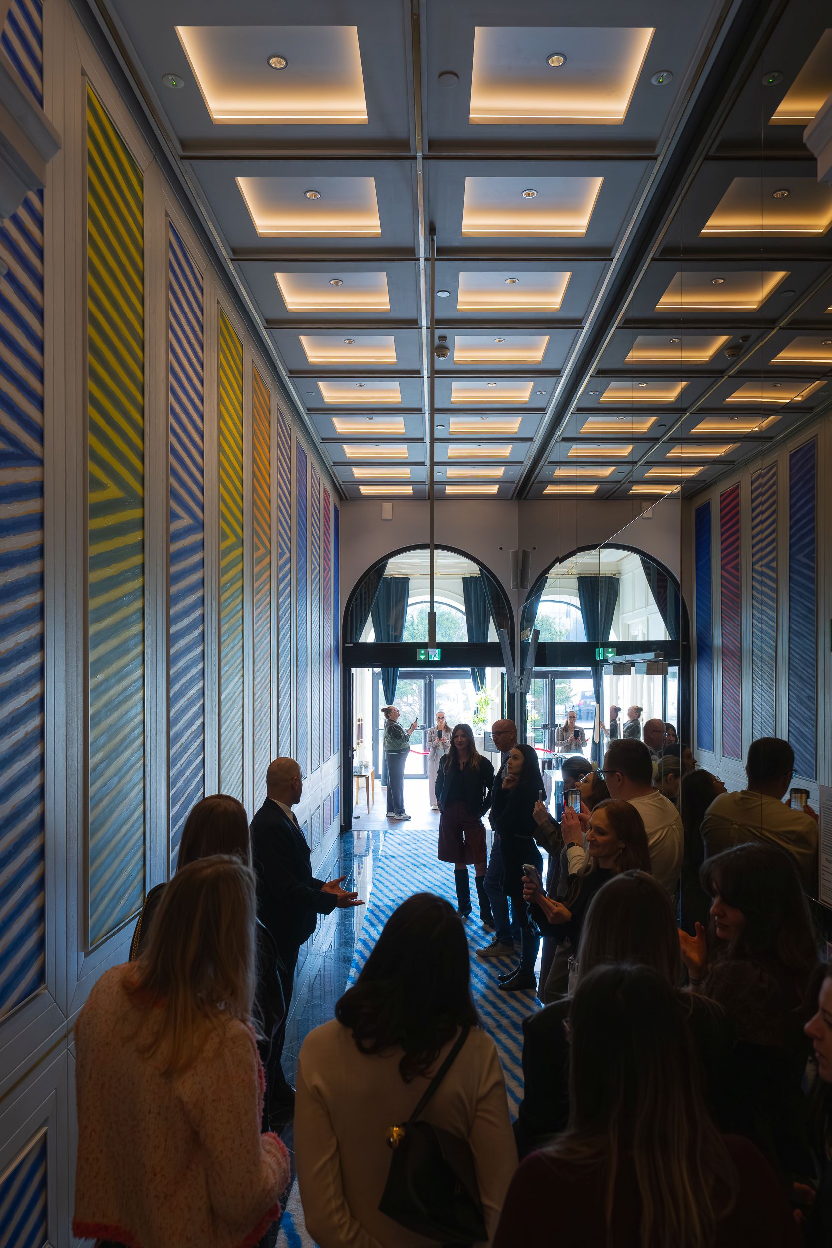 W Raffles znajduje się około 500 obiektów sztuki XX i XXI wieku, co czyni tę kolekcję jednym z największych prywatnych zbiorów, dostępnych publicznie w Polsce. Obrazy, fotografie, plakaty, rzeźby i instalacje wielu wybitnych artystów nie są tu jedynie dekoracyjnym tłem, ale świadomą komponentą doświadczania przestrzeni. Pierwszym dziełem, które przyciągnęło uwagę, była szklana rzeźba Doroty Buczkowskiej. Ambasadorzy Kontakt-Simon podziwiali także stalową formę TAJDO Oskara Zięty w lobby i świetlną instalację „Granice” Włodzimierza Jana Zakrzewskiego. Spacer kontynuowano z twórczością Leona Tarasewicza i Wilhelma Sasnala, a przechodząc przez kolejne korytarze, architekci odkrywali ukryte detale – mozaikę „Porwanie Europy” Krystyny Kozłowskiej czy kolekcję porcelany i szkła z lat 60., 70. i 80., która przywołuje ducha minionych dekad Warszawy. Nad powstaniem tej kolekcji czuwały Anda Rottenberg, kuratorka i krytyczka sztuki współczesnej, oraz Barbara Piwowarska, doświadczona ekspertka w zakresie kolekcji prywatnych. Wybrane przez nie prace wnikają w codzienne przestrzenie hotelu i pozwalają poczuć, że bycie blisko sztuki towarzyszy gościom hotelu na co dzień.