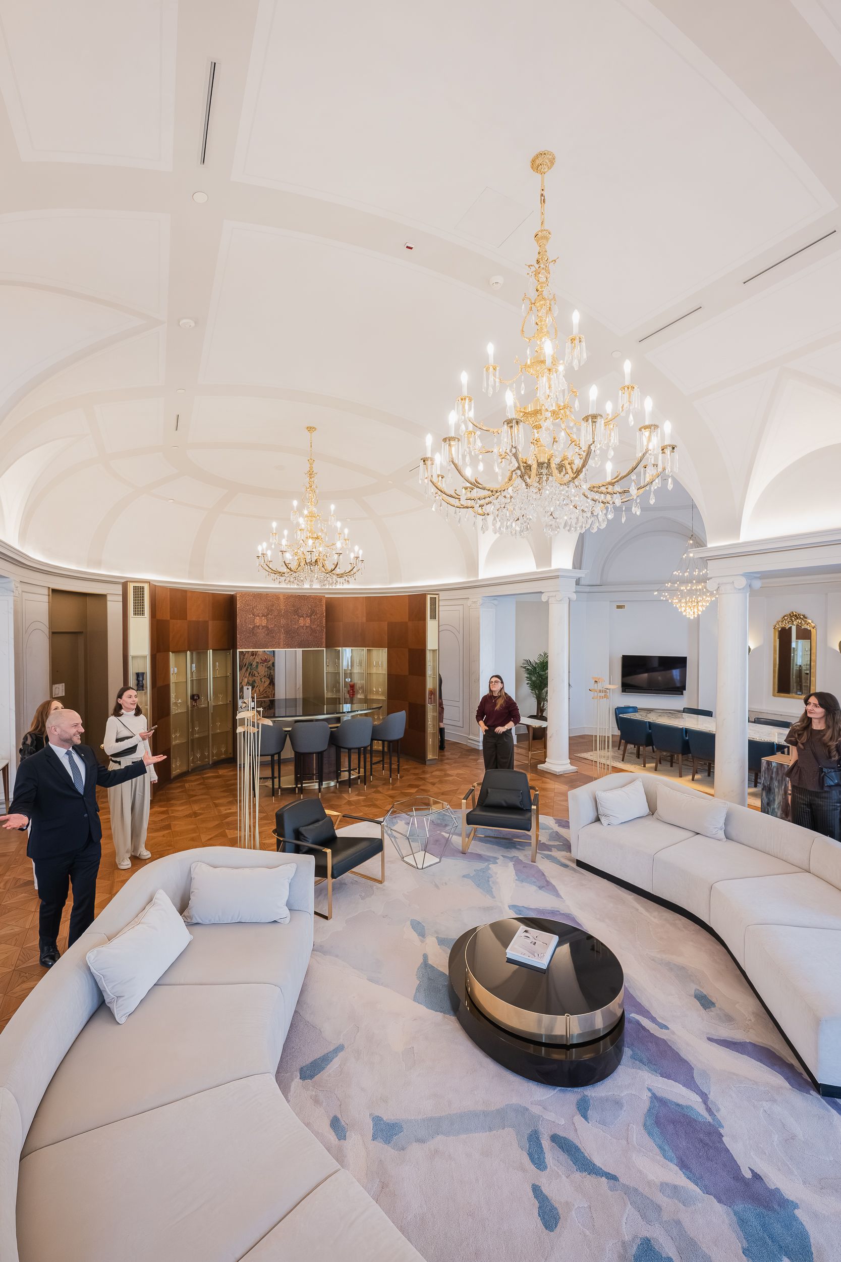 Podczas spaceru architekci mieli także okazję zajrzeć do Apartamentu Królewskiego, czyli historycznej Sali Pompejańskiej dawnego Hotelu Europejskiego, oraz kameralnego Humidoru; salonu whisky i cygar, w którym dyskretna elegancja tworzyła świetną atmosferę do rozmów. Właśnie ten rodzaj luksusu, wyważony i w pełni przemyślany, pokazał, dlaczego międzynarodowi goście tak chętnie wracają do Raffles.