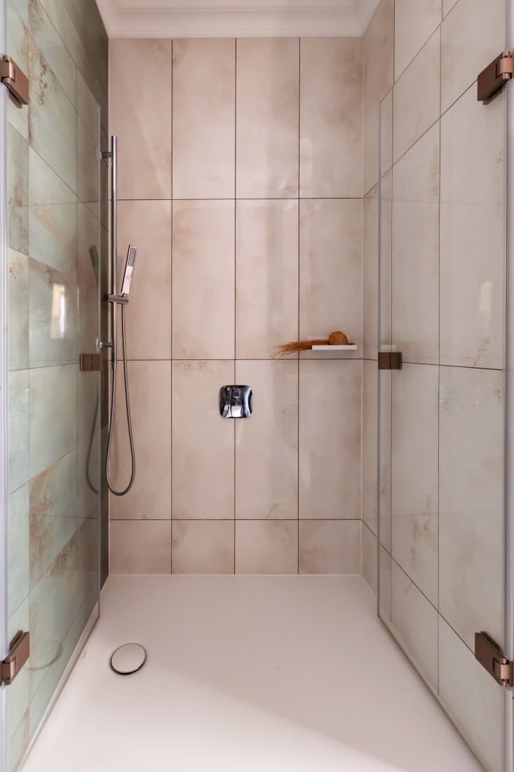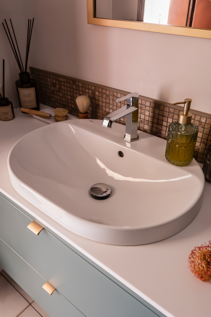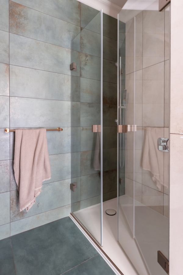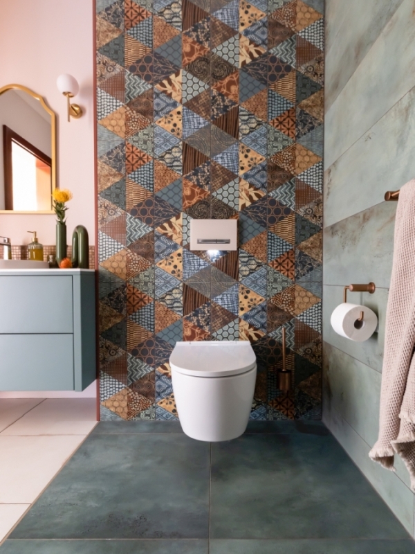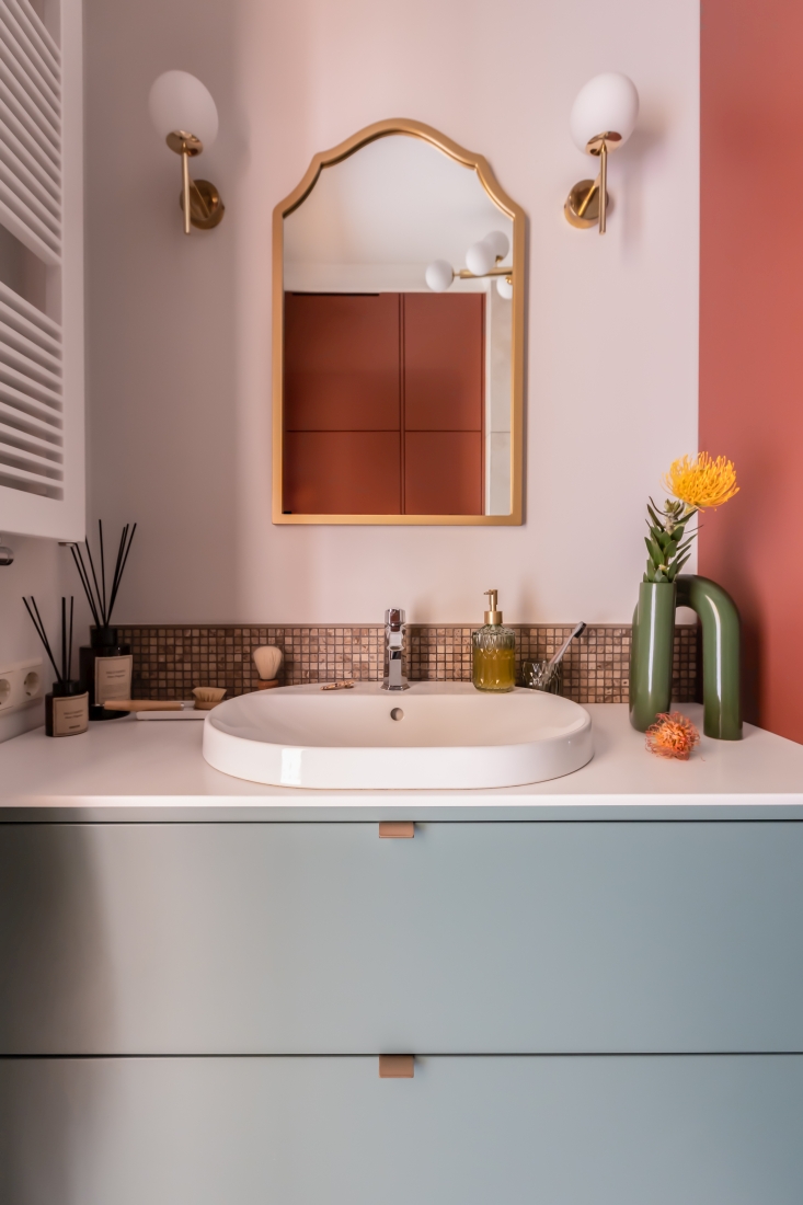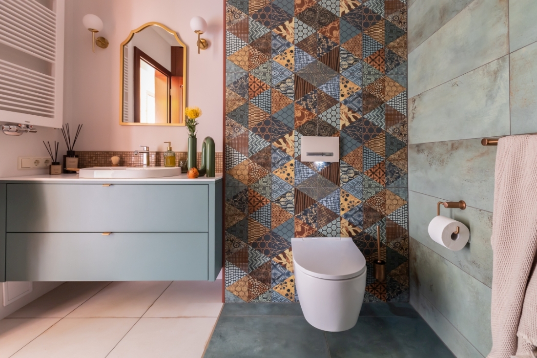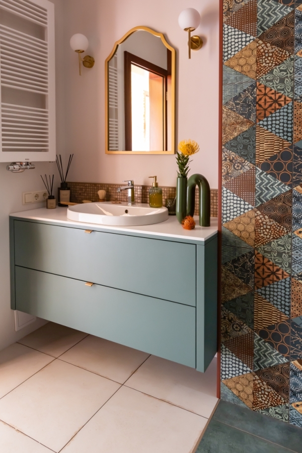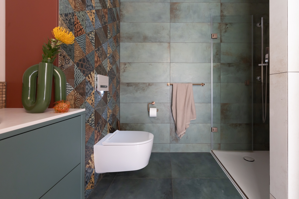 Kolorystykę tego wnętrza podpowiedziała Pani domu, która postawiła na jasne i zielone tonacje jako bazę dla płytek. Projektantka Kasia Orwat odważnie połączyła te kolory z dynamicznym, etnicznym dekorem na tylnej ściance WC. Taki wybór dodał łazience unikalnego charakteru i wprowadził do wnętrza nieco egzotycznej atmosfery. Dodatkowo, do aranżacji wkomponowano kolor marone, który pojawił się zarówno w dekorze, jak i w meblach. Nad umywalką znalazła się kamienna mozaika, która połączyła kolorystycznie całość wnętrza. Nie tylko pełni funkcję dekoracyjną, ale dodaje łazience nieco wakacyjnego charakteru. Ważnym elementem wystroju są także złoto-miedziane akcenty, które pojawiają się w oprawach świetlnych, uchwytach, okuciach ścianki natryskowej oraz akcesoriach łazienkowych. Detale te wprowadzają do wnętrza nutę glamour, zachowując jednocześnie spójność stylistyczną.