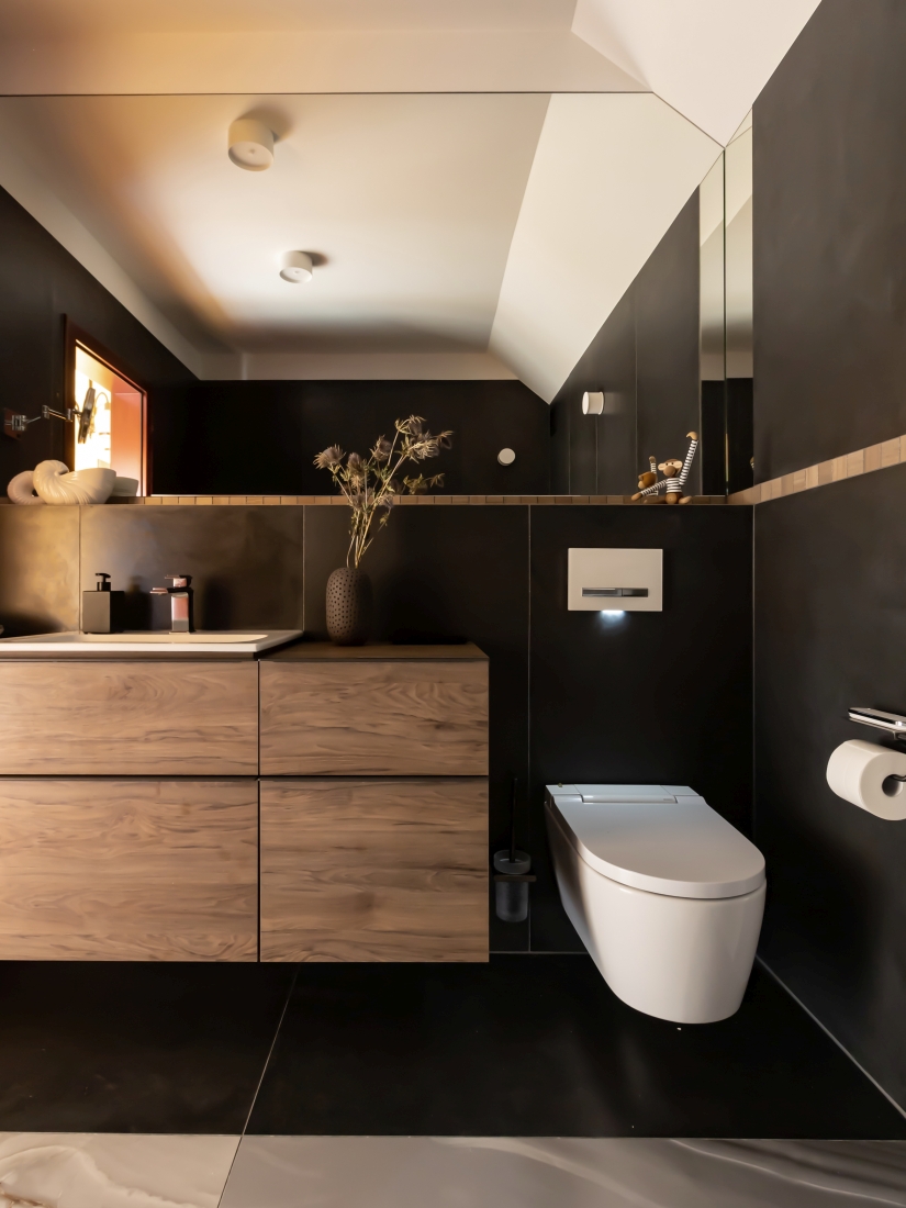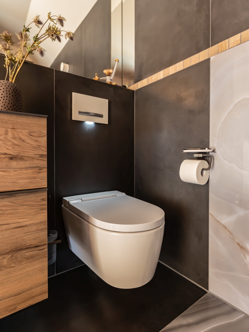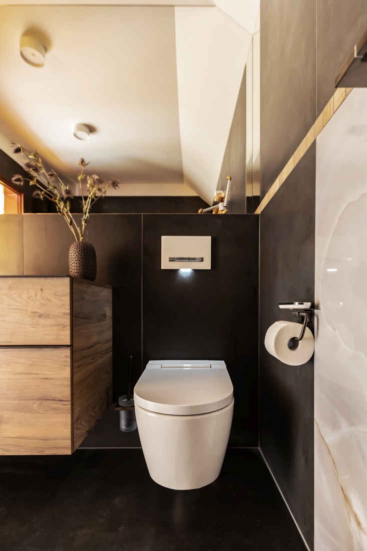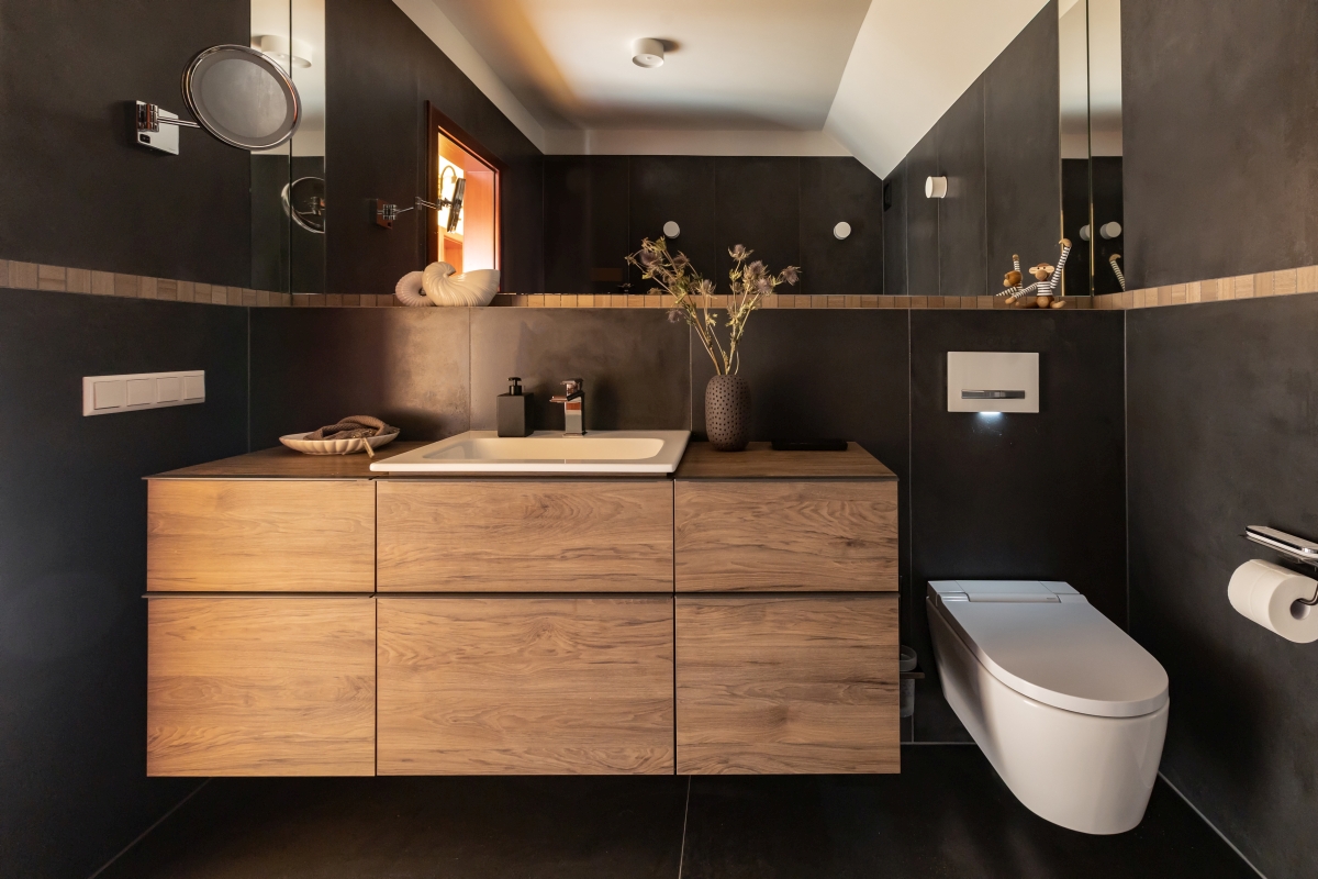 Łazienka na piętrze została zaprojektowana z kolei z myślą o Panu domu, który ceni sobie ciemniejszą stylistykę i nowoczesne rozwiązania technologiczne. Ten męski azyl wyróżnia się zimnymi tonacjami, które nadają mu elegancji i nieco surowego charakteru. Centralnym elementem łazienki jest toaleta myjąca Geberit AquaClean Sela, łącząca w sobie funkcjonalność i zaawansowaną technologię. Zapewnia wyjątkowy komfort użytkowania dzięki funkcji mycia, dbającej o higienę osobistą na najwyższym poziomie. Dodatkowo, system DuoFresh skutecznie odciąga nieprzyjemne zapachy bezpośrednio z miski WC, co gwarantuje w pomieszczeniu świeże powietrze.