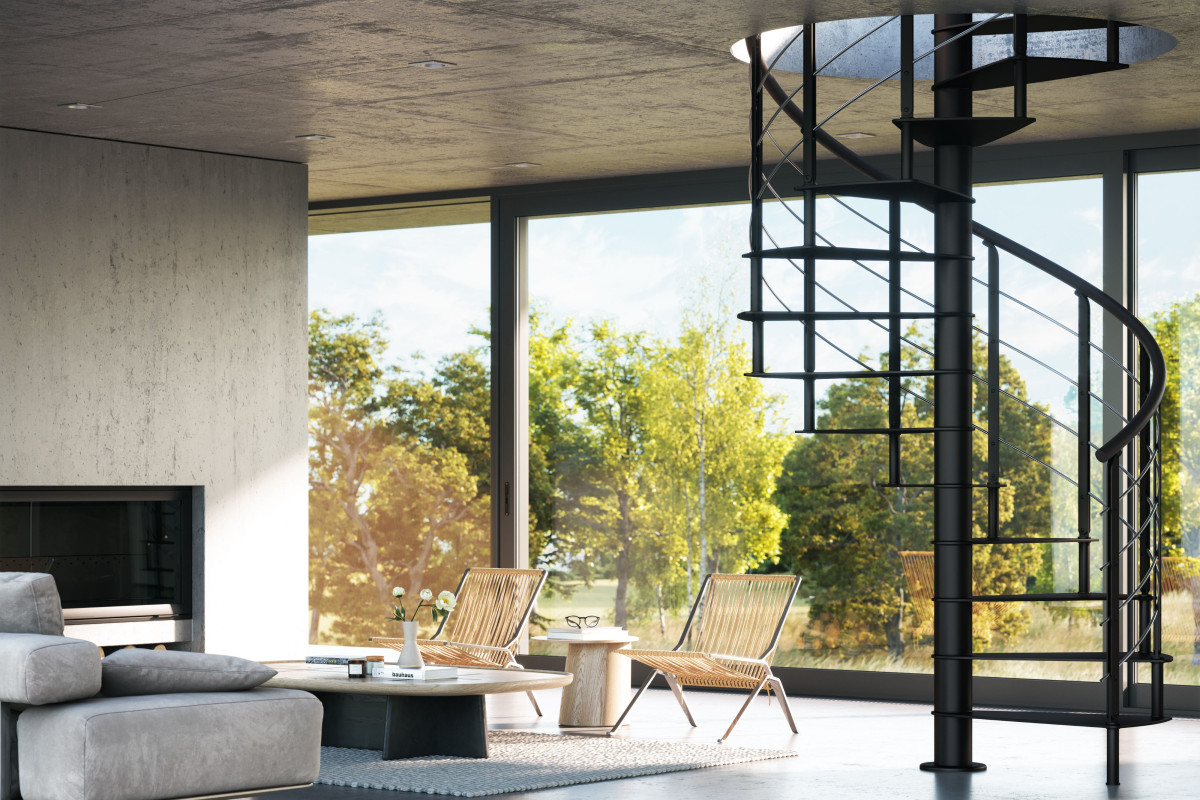 Fot. Schody Rintal Polska Schody kręcone Trio Metal oparte na metalowym słupie centralnym. Stopnie z 10 mm blachy. Balustrada Filo Metal.
