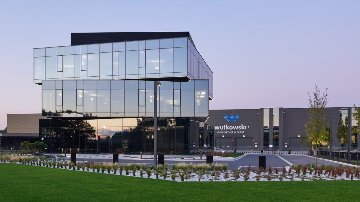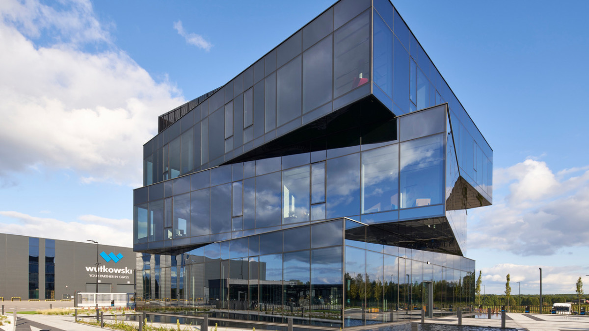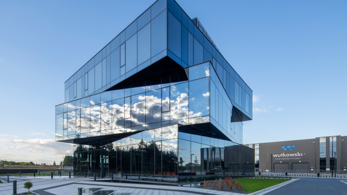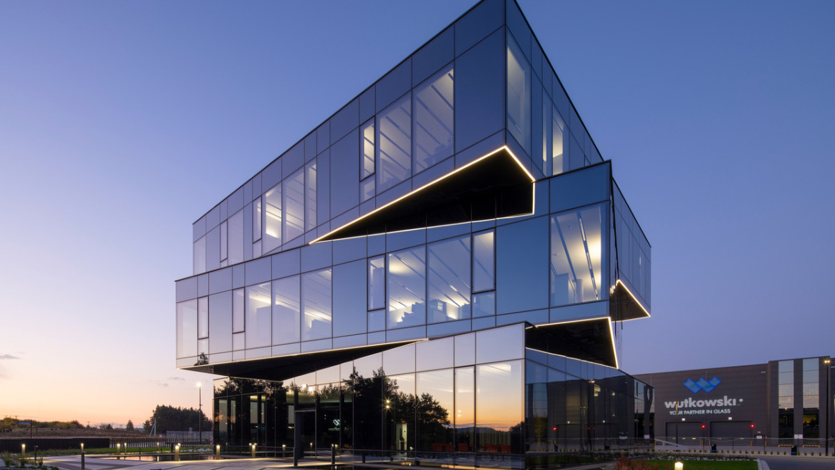 Dominującym elementem estetycznym budynku jest jego elewacja – niemal w całości przeszklona, stanowiąca zarówno deklarację projektową, jak i czytelne odwołanie do profilu działalności inwestora. Firma Wutkowski od lat specjalizuje się w nowoczesnych technologiach szklarskich, a zastosowanie szkła jako głównego materiału fasadowego to świadoma decyzja, mająca na celu wizualne zespolenie obiektu z branżą, którą reprezentuje.
