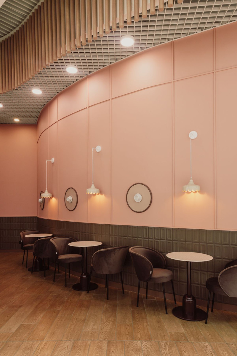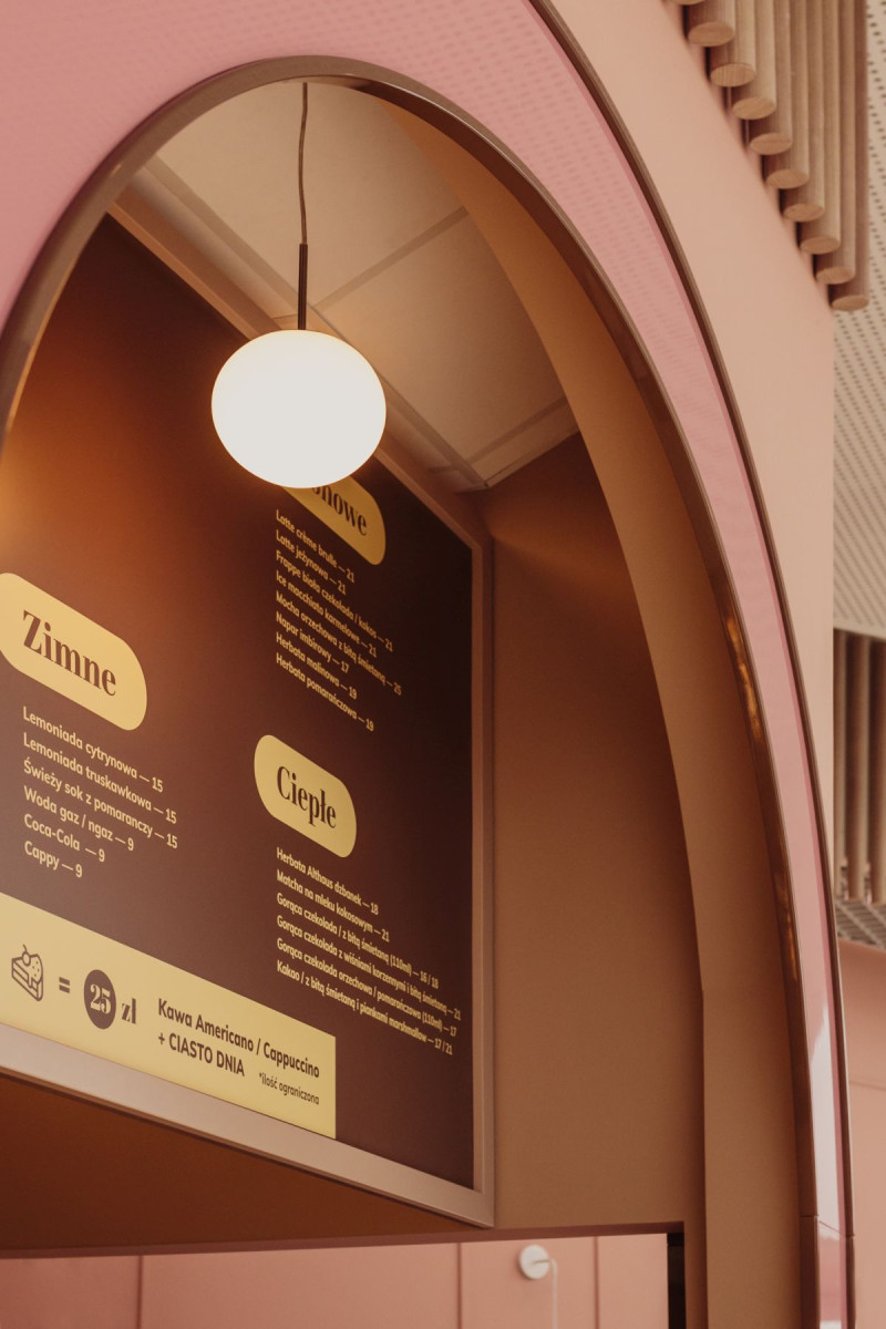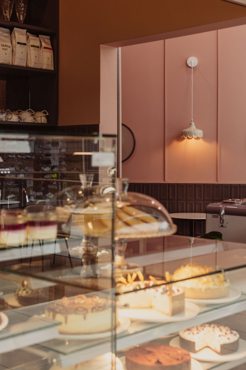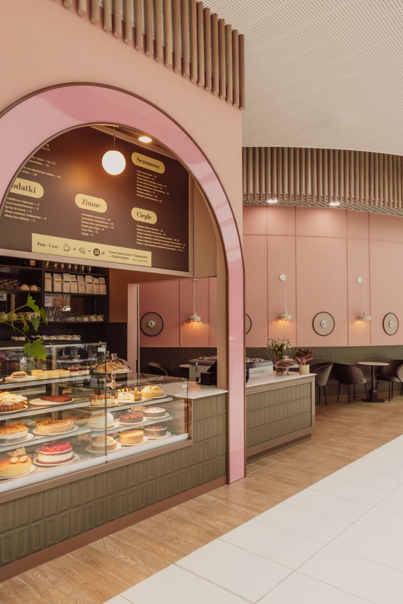 W cukierni dominują barwy zgaszonego różu, przełamane ciepłym brązem. To połączenie kolorów jest eleganckie a jednocześnie stonowane, tworząc atmosferę spokoju i relaksu, której pragnie każdy przemęczony klient galerii handlowej. Na ścianach i ladzie znalazły się płytki, które przywołują na myśl słodki smak i zapach czekolady – coś, co kojarzy się z przyjemnością i komfortem. Matowe powierzchnie zostały przełamane błyszczącymi elementami, które przypominają lukier na świeżo upieczonych ciastach. Te subtelne nawiązania są prawdziwą ucztą dla zmysłów oraz dodają głębi i charakteru przestrzeni.