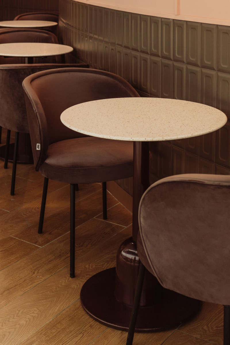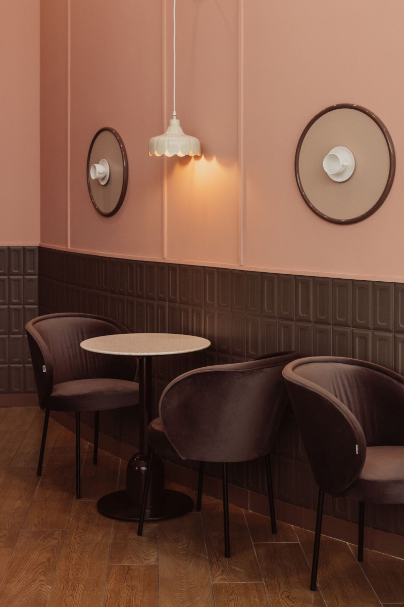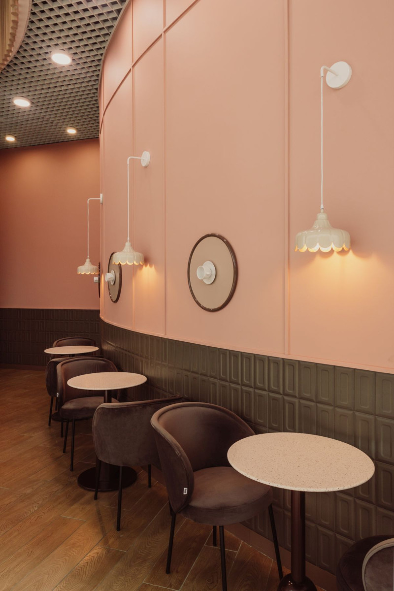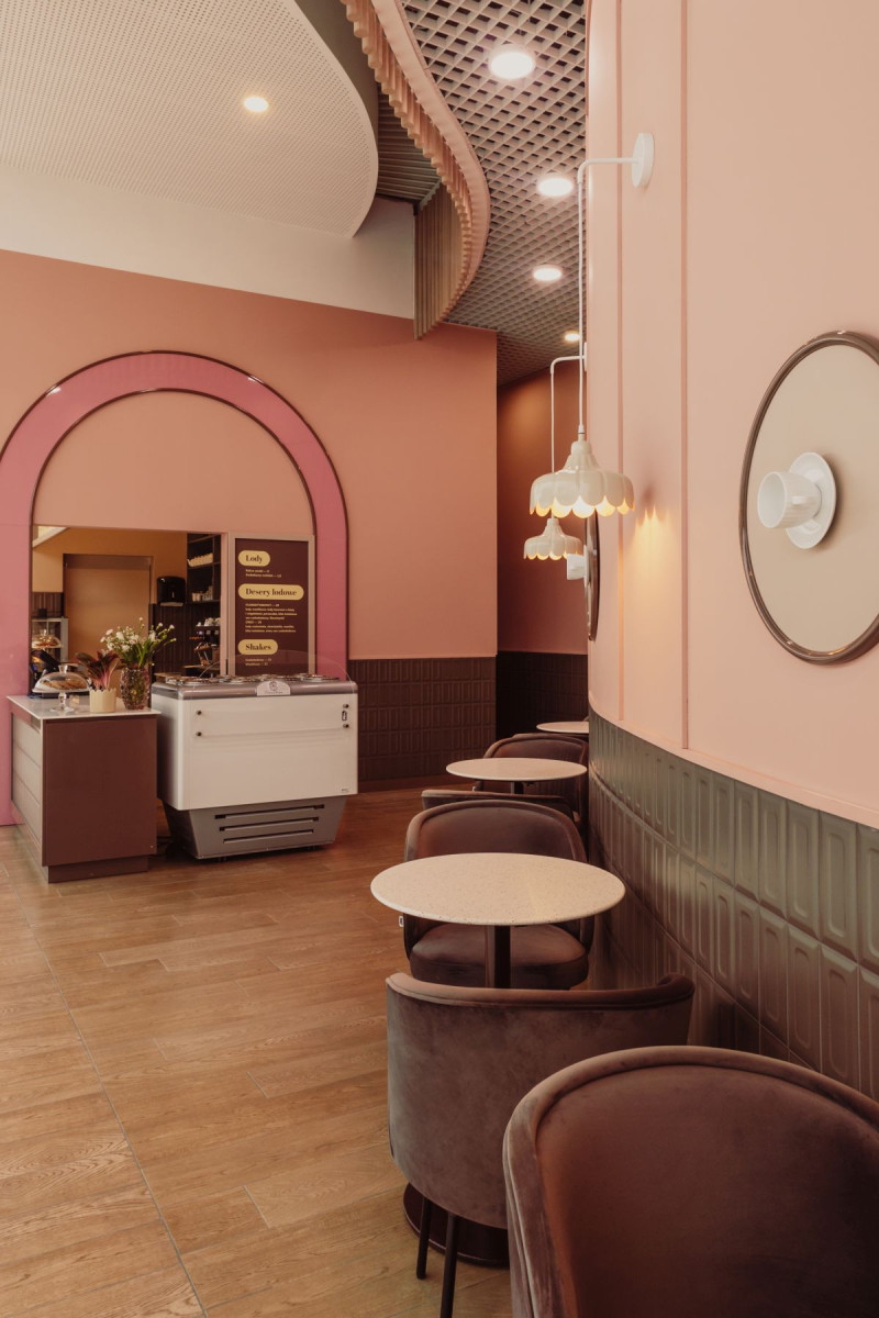 W cukierni dominują barwy zgaszonego różu, przełamane ciepłym brązem. To połączenie kolorów jest eleganckie a jednocześnie stonowane, tworząc atmosferę spokoju i relaksu, której pragnie każdy przemęczony klient galerii handlowej. Na ścianach i ladzie znalazły się płytki, które przywołują na myśl słodki smak i zapach czekolady – coś, co kojarzy się z przyjemnością i komfortem. Matowe powierzchnie zostały przełamane błyszczącymi elementami, które przypominają lukier na świeżo upieczonych ciastach. Te subtelne nawiązania są prawdziwą ucztą dla zmysłów oraz dodają głębi i charakteru przestrzeni.