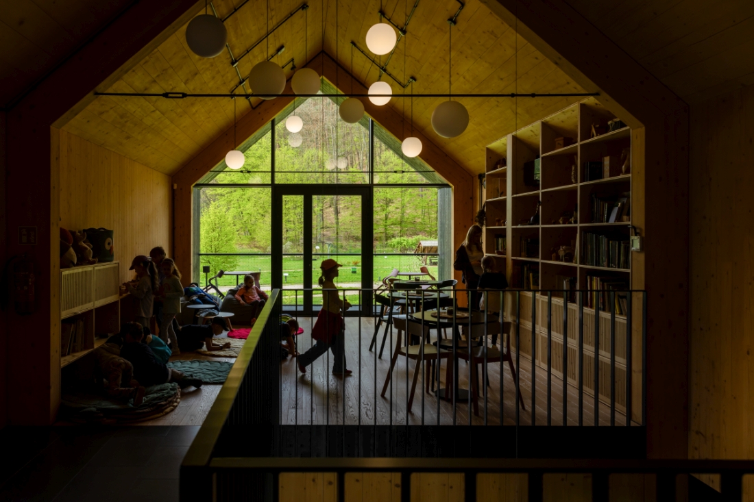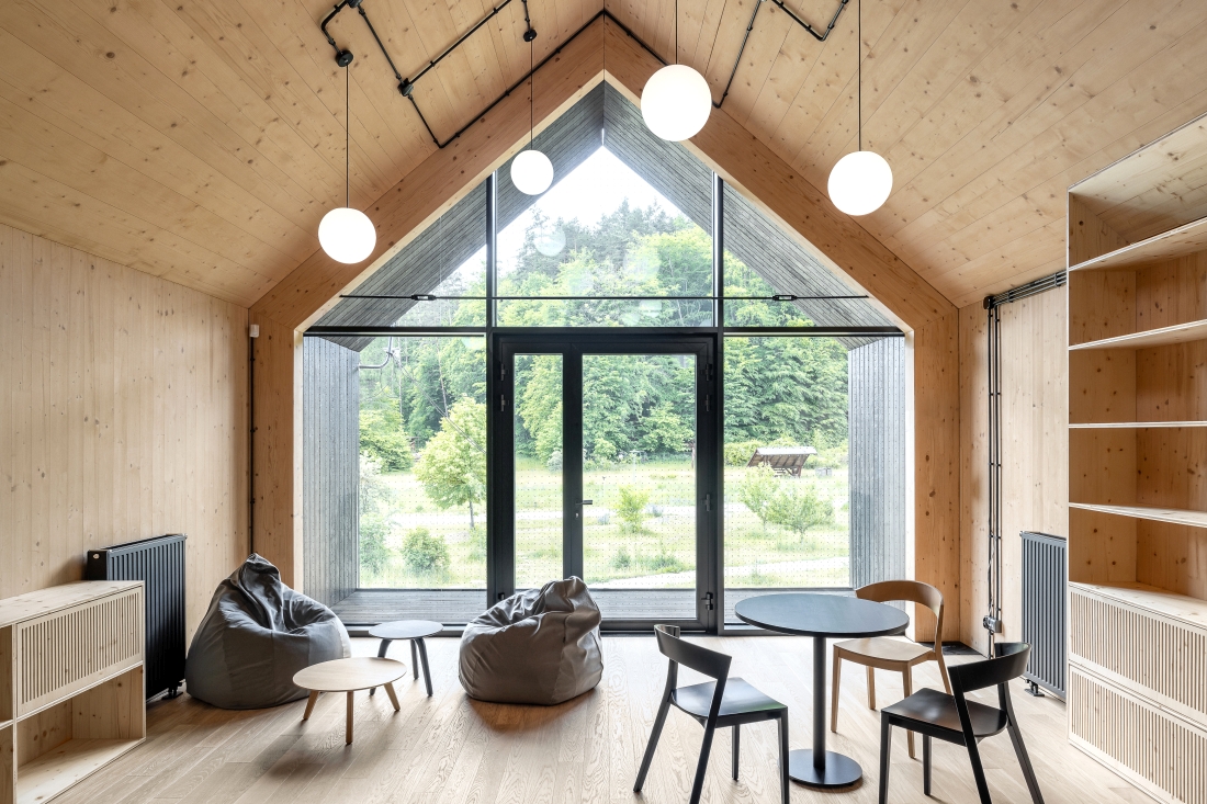 Otwarty charakter wnętrza poszerza możliwości dotarcia do różnych grup odbiorców – nie tylko dzieci i młodzieży przyjeżdżającej tu na zajęcia edukacyjne lub osób odwiedzających ogród. Co ciekawe, sam budynek – za sprawą swojej konstrukcji i użytych materiałów – stał się elementem działalności edukacyjnej, pokazując potencjał i różnorodność zastosowania drewna w architekturze.
