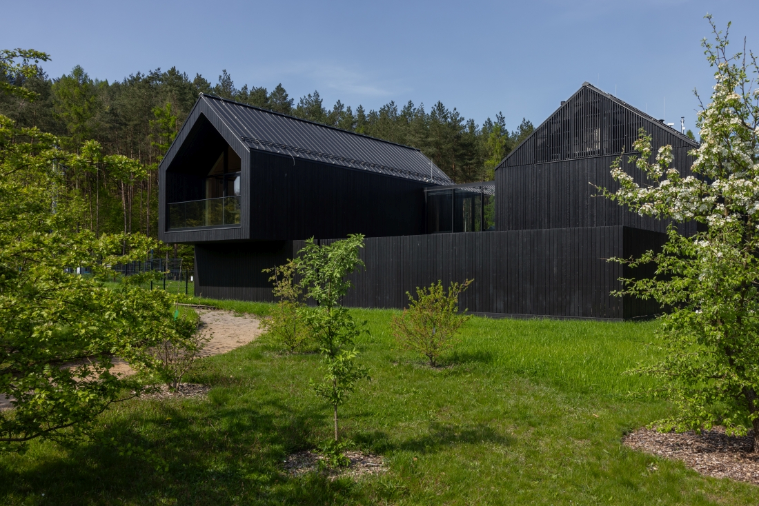 Emanujące naturalnym ciepłem drewno użyte wewnątrz budynku kontrastuje z czarną okładziną fasady. Powierzchnia desek została celowo zwęglona przy użyciu starożytnej japońskiej techniki Shou Sugi Ban. Ta nietypowa metoda wykończenia nawiązuje do tradycji regionu, gdy rolnicy w ten oryginalny, a przy tym naturalny sposób zabezpieczali drewno przed działaniem warunków atmosferycznych, promieniami UV i szkodnikami, przeciwdziałając jego degradacji. Podobnie jak w przypadku zastosowania technologii CLT, jest to pierwsza w Polsce realizacja budynku użyteczności publicznej z taką elewacją.