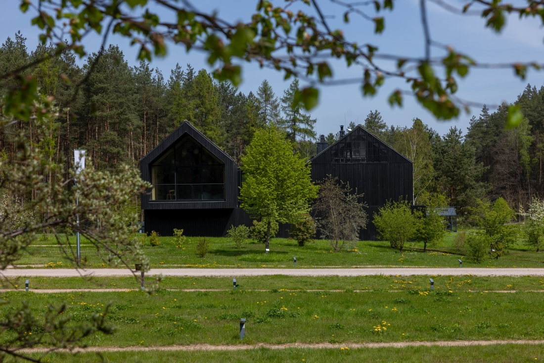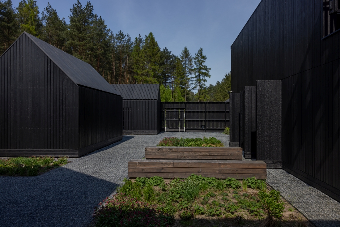 Zabudowę, nawiązującą do archetypicznej koncepcji stodół, otacza ogrodzenie, tworzące dwa kameralne dziedzińce. W efekcie do złudzenia przypomina ona dawną osadę ze współczesną interpretacją drewnianego wału.