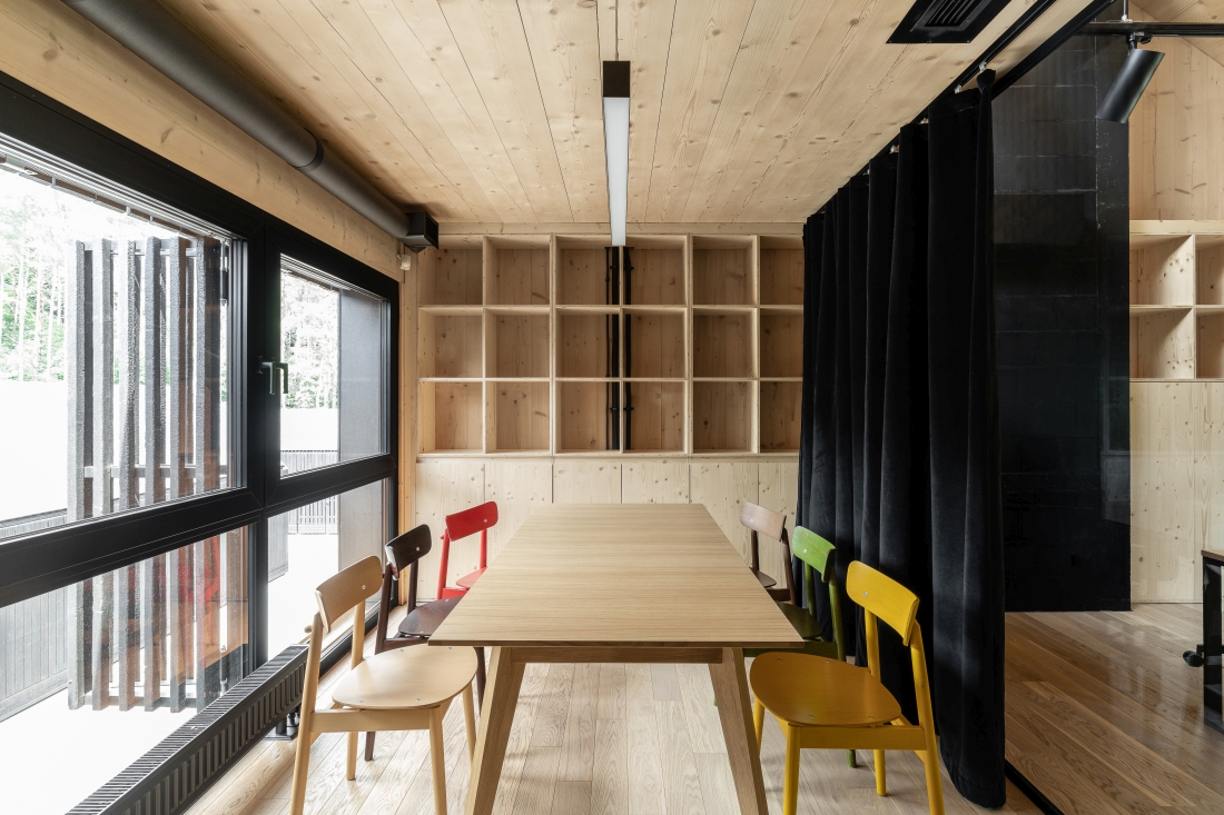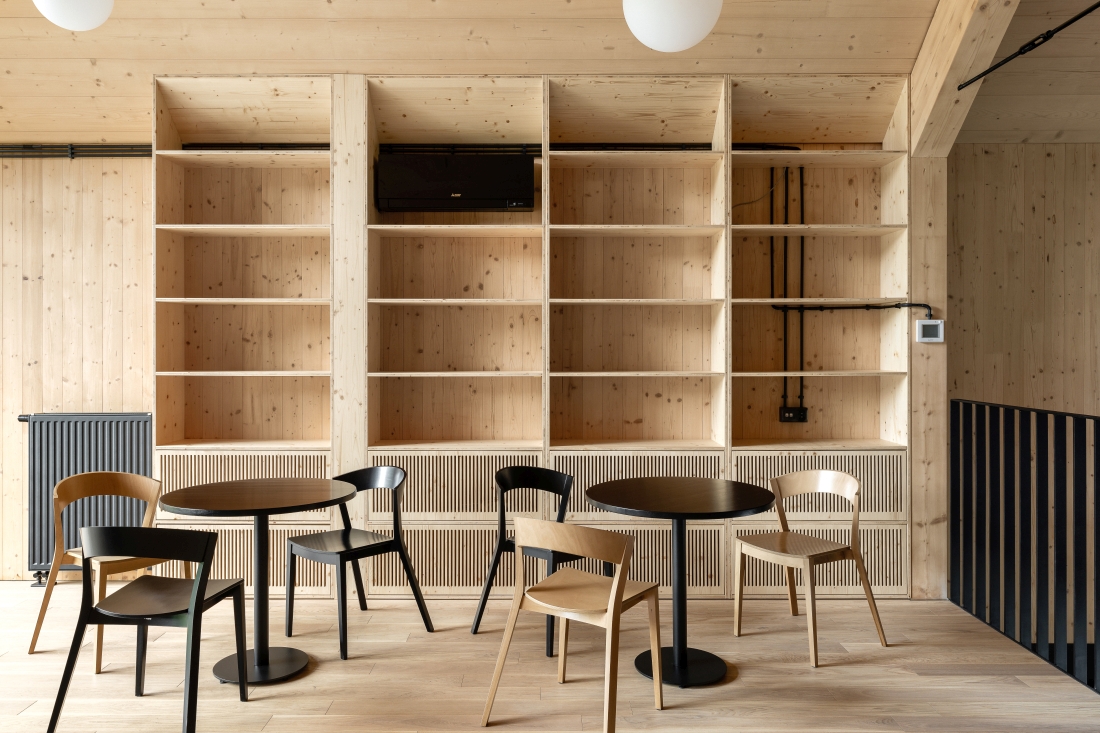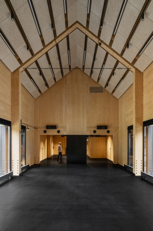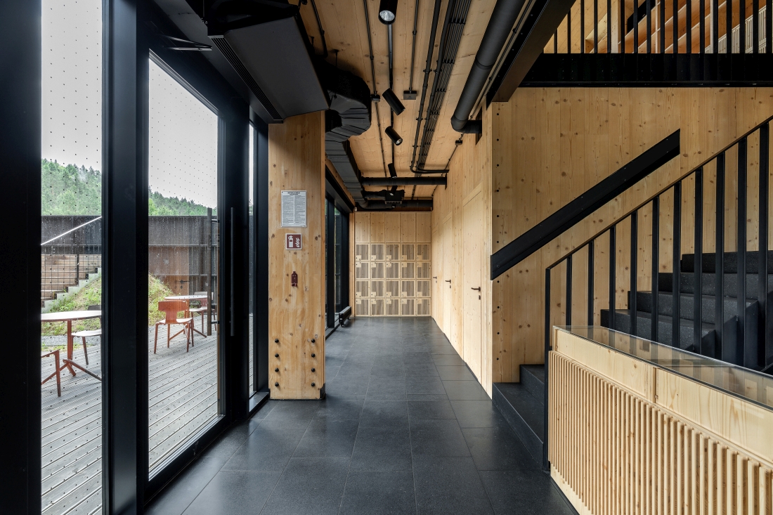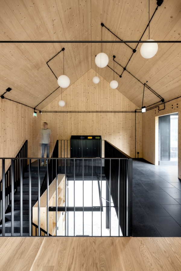 Wnętrza zyskały industrialny styl. Wyeksponowano elementy konstrukcyjne oraz drewniane panele, które pozbawione są dodatkowego wykończenia. Drewniane jest także wyposażenie i umeblowanie. Wielość użytych elementów z drewna buduje wrażenie naturalności i podkreśla proekologiczny charakter budynku, tworząc wrażenie komfortu i bezpieczeństwa. Widok drewna, jego faktura i zapach wpływają pozytywnie na odbiór wnętrza i oddziałują na zmysły użytkowników budynku.