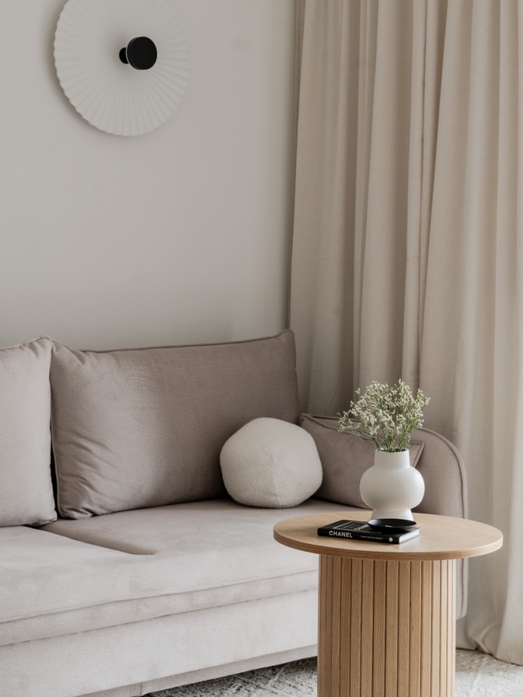 Wnętrze ujmuje przytulnością, której architektka dodała mu „ubierając” wiele elementów wystroju w urodziwe odcienie kaszmirowe. – ,,Chcę, żeby było minimalistycznie, ale w ciepłych, otulających barwach” – zażyczyła sobie inwestorka. Spośród gamy odcieni neutralnych szczególnie spodobał się jej modny kaszmirowy – elegancka mieszanka szarości, beżu i delikatnego kremu kojarząca się z miękkością i luksusem kaszmirowych tkanin. To on stał się kolorystycznym lejtmotywem projektu – opowiada architektka. Kaszmirowa paleta wyróżnia się głębią, która sprawia, że wnętrza nią „otulone” zyskują subtelną elegancję. – Pojawia się na frontach kuchennych i zabudowach szaf, w pokoju oraz w łazience. Odnajdujemy go za wezgłowiem łóżka w postaci tapety. W tej przyjemnie zmysłowej gamie mieszczą się również fakturalne poduszki i obicia mebli tapicerowanych – uzupełnia autorka aranżacji.