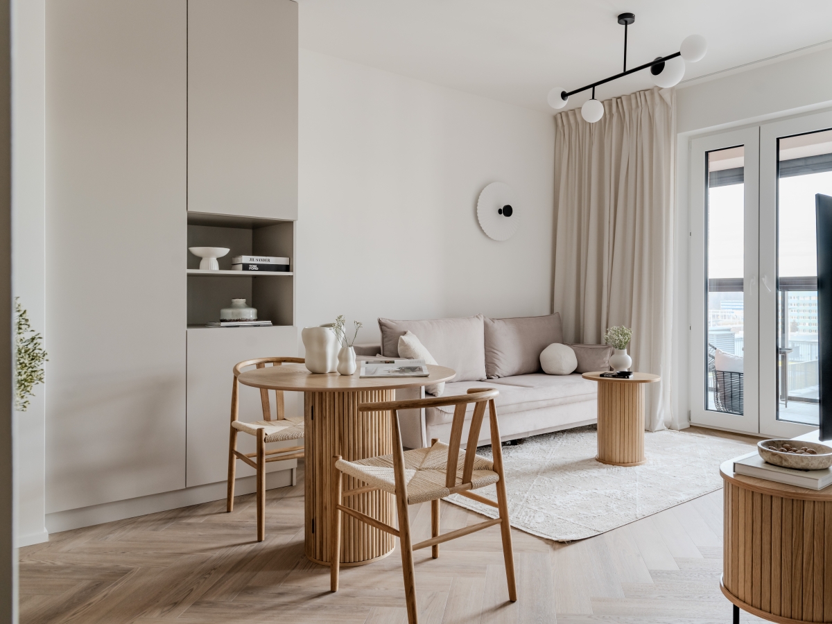 Ma zaledwie 36 m2, lecz – przedłużone przeszkloną loggią – wydaje się większe. Zlokalizowane na wyższym piętrze Tobaco Park II przy ulicy Kopernika zostało zaprojektowane przez Martynę Midel. – Jest oszczędne w wyrazie, z maksymalnym wykorzystaniem przestrzeni, w odcieniach neutralnych – współczesnych i zarazem ponadczasowych. Naturalne, jasne drewno ociepla całość. Szafkę RTV, stół i stolik kawowy, łączy, poza materiałem, wykończenie w formie lameli – wymienia architektka.