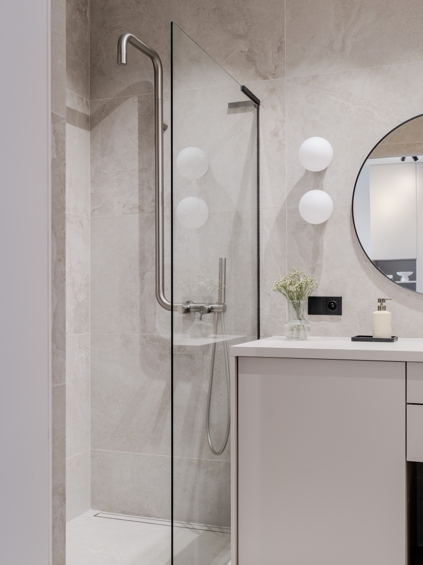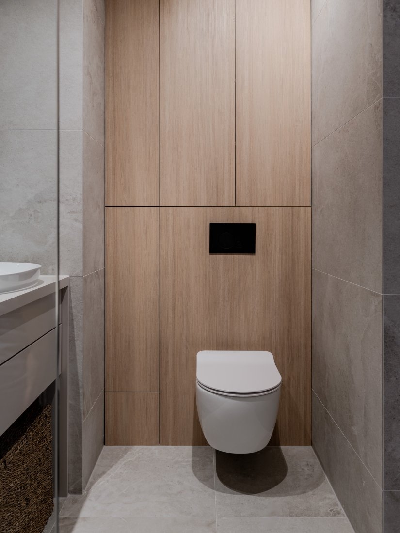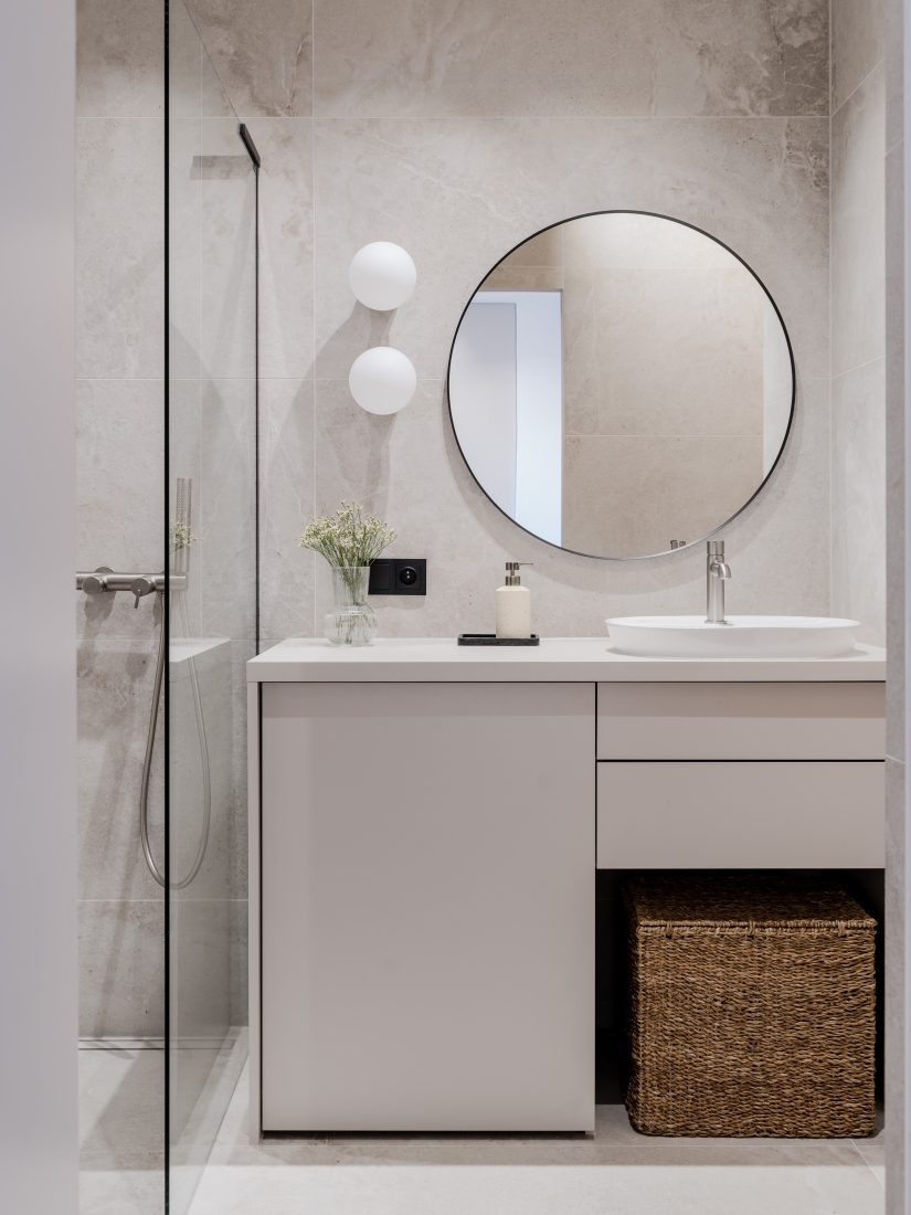 Dwie ściany w sypialni oraz ścianę w holu pokryto tapetą imitującą tkaninę o wyczuwalnym splocie. Żeby dodatkowo ocieplić wizualnie mieszkanie, przy zachowaniu priorytetu ujednolicenia i ukrycia tego, co możliwe w zabudowach stałych. – Faktury dodają głębi, pozwalają uniknąć poczucia „płaskiego” pudełka. W łazience zastosowałam wielkoformatowe płytki, których powierzchnia imituje kamień i równocześnie stanowi kontynuację „wątku kaszmirowego”. Wyczuwalne pod ręką struktury, miękkie materiały łagodzą ascetyczny wyraz wystroju nie kłócąc się z ideą minimalizmu – dodaje Martyna Midel.